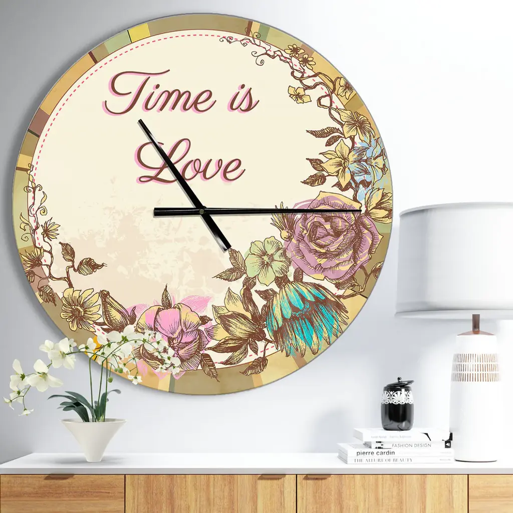 Time Is Love Vintage Flower Wreath Oversized Quote Metal Clock, 23"x23"