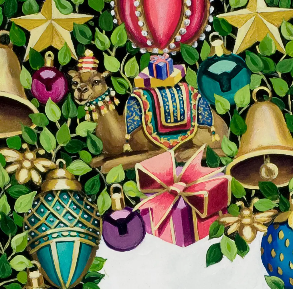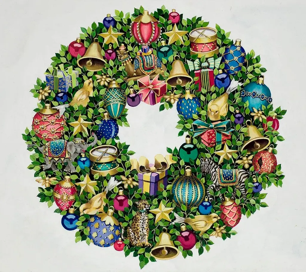 Adorned with colorful, classic ornaments as well as exotic animals in gilded attire, this trompe l'oeil holiday wreath is made from an original oil painting and varnished onto wood. Made in America. Hanger on back extends ½" from wall.