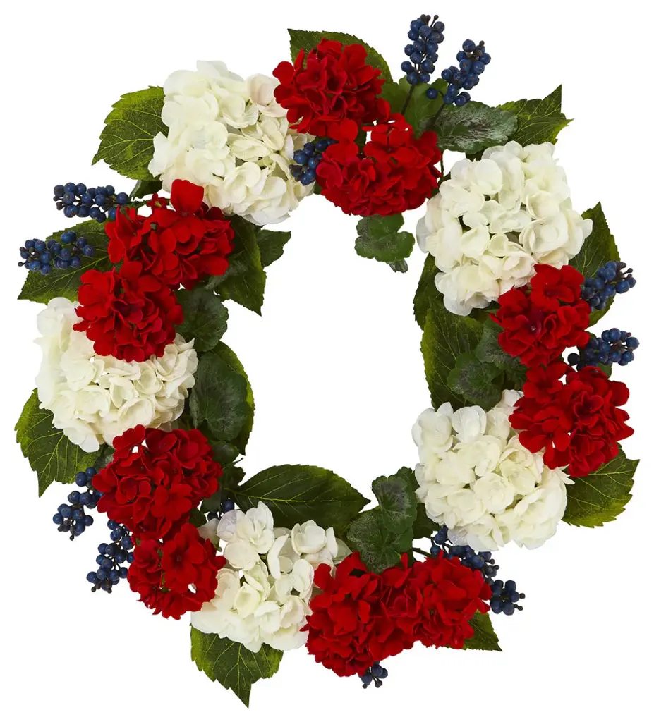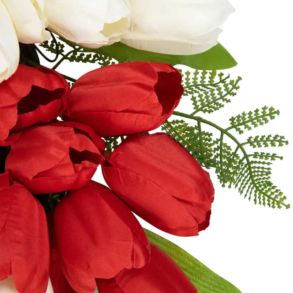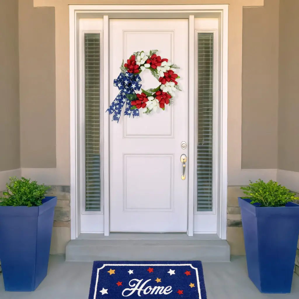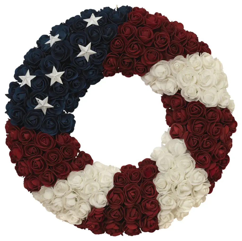 This stunning wreath is a vibrant tribute to the beauty and pride of the United States making it the perfect piece for your holiday or year-round Americana decor. This flag-inspired wreath showcases a delightful arrangement of Tulip flowers in patriotic hues of red and white. A big blue bow with white stars completes the look. Whether you''re hosting a Fourth of July celebration or simply want to showcase your love for your country this wreath is a true symbol of patriotism Product Features: Patriotic floral wreath Adorned with red and white Tulips delicately nestled amidst a medley of lush greenery Enhanced with a blue and white star ribbon bow Recommended for indoor use - if using outdoors place under a covered area No assembly required " wreath comes in 1 piece Natural twig grapevine backing Comes ready to hang on a plastic loop Dimensions: 24" diameter (measured from outermost tip/edge to outermost tip/edge across the wreath) Material(s): PVC/polyester/wire/twig