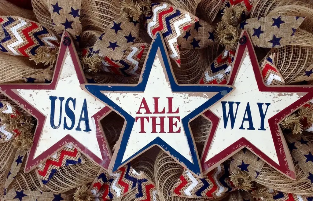 Beautiful! New! Pemium! Full! Handmade Patriotic Wreath. Three rustic wood stars, with the wording " USA All The Way", rests on a bed of creamy burlap. The stars are distressed white and outlined in red and blue. Burlap red, white and blue chevron ribbons and canvas ribbons with navy blue stars surround the center. The outer ring has beautiful red burlap with blue canvas star ribbons. Perfect for all patriotic holidays and year round home decor. Measurements are a large 24 inch diameter and 6 inches deep.