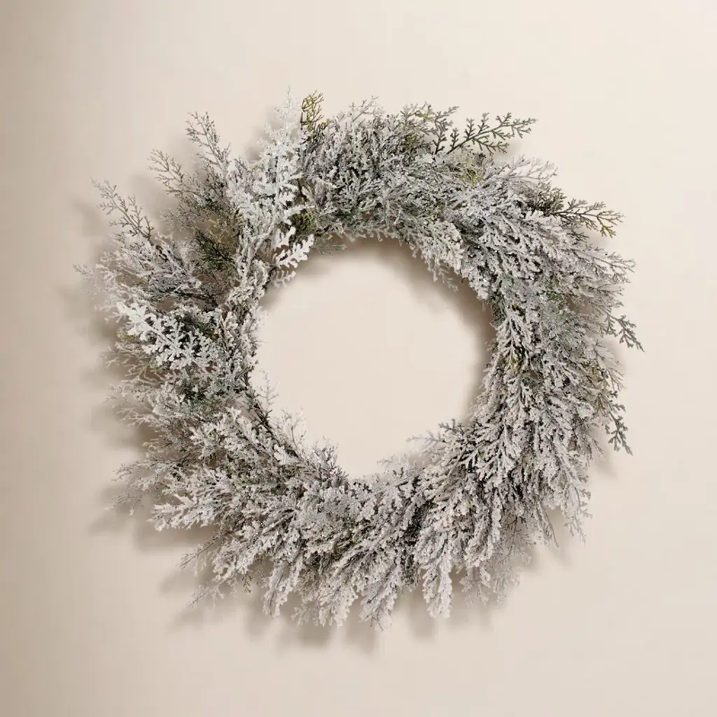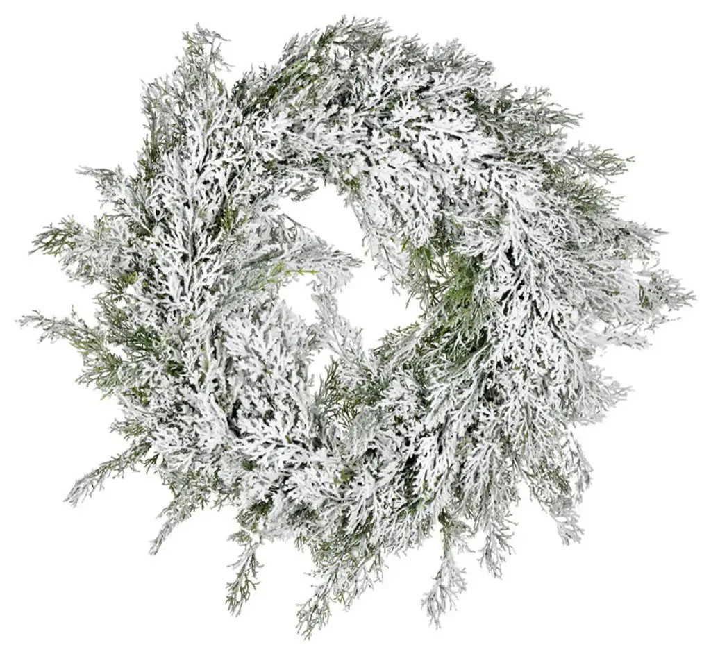 Vickerman 42" Flocked Snow Ridge Artificial Christmas Wreath with 224 PVC Tips. Add some holiday spirit to your front door or mantle with this frosty wreath. This wreath comes unlit, features beautifully flocked PVC tips, and measures 42" across the diameter from the end of one tip to another.
