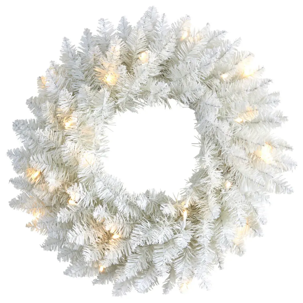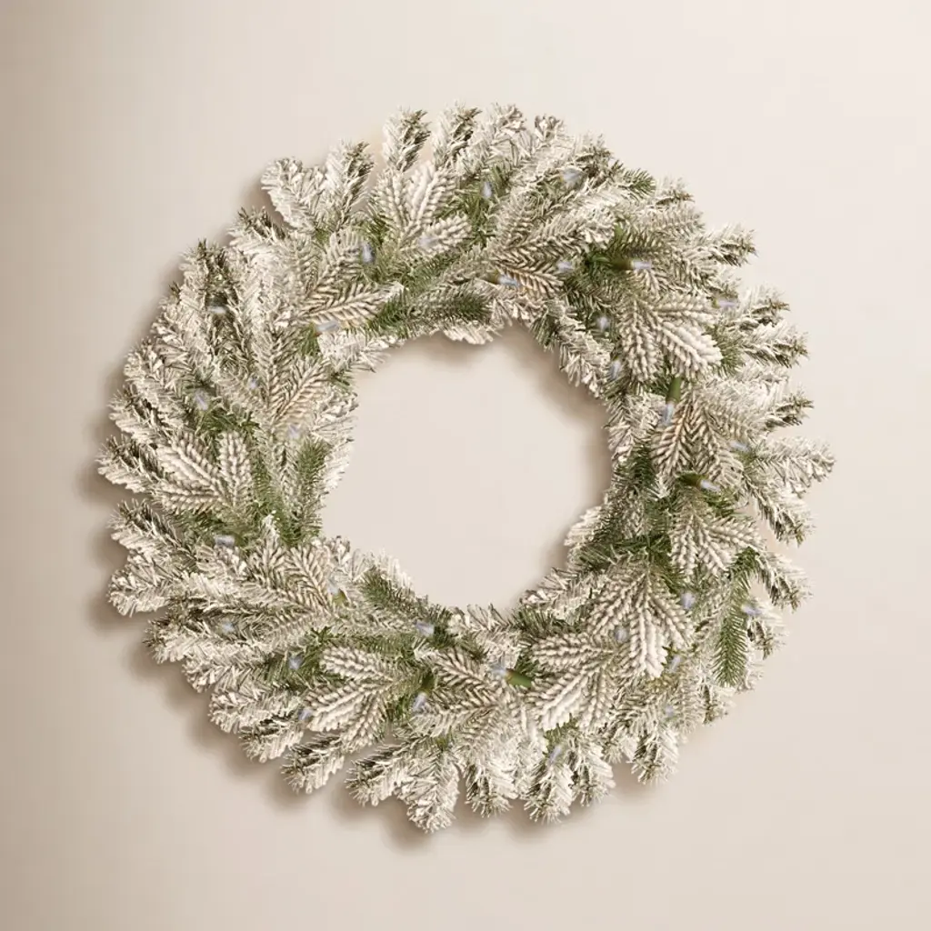 Add some wintry holiday cheer to your front door or mantle with this beautifully flocked Vickerman Alberta Spruce Christmas wreath. This frosty wreath comes pre-lit with 50 warm white LED lights, features 110 heavily flocked PVC tips with 12 realistic pine cone accents, and runs on 120V AC. This wreath measures 30" across the diameter from the end of one tip to another.