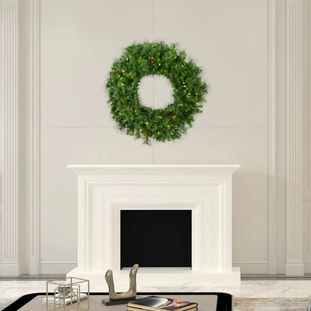 Vickerman 36" Cheyenne Pine Artificial Christmas Wreath with 340 PVC Tips and 100 Warm White LED Lights. Add some holiday spirit to your front door or mantle with this Cheyenne wreath, it comes prelit with Warm White LED Mini Lights that run on 120V AC, and is made of traditional PVC Tips. The Cheyenne blend features a mixture of needle lengths, light to dark green needle tones, and incorporates pinecones to create a realistic look. This wreath measures 36" across the diameter from the end of one tip to another.