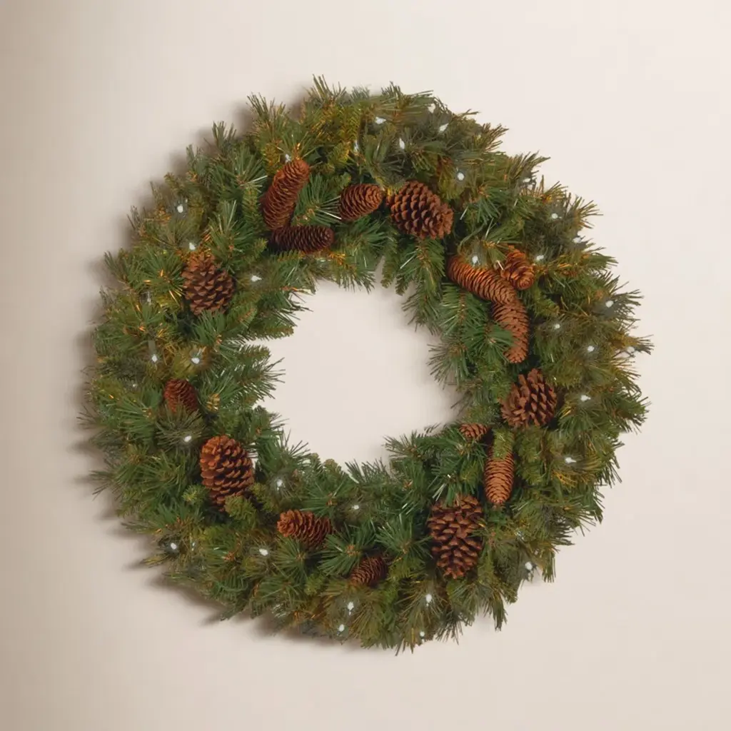 Vickerman 48" Cheyenne Pine Artificial Christmas Wreath with 450 PVC Tips and 200 Warm White Italian LED Lights. Add some holiday spirit to your front door or mantle with this Cheyenne wreath, it comes prelit with Warm White LED Mini Lights that run on 120V AC, and is made of traditional PVC Tips. The Cheyenne blend features a mixture of needle lengths, light to dark green needle tones, and incorporates pinecones to create a realistic look. This wreath measures 48" across the diameter from the end of one tip to another. Metal ring construction provides a durable design