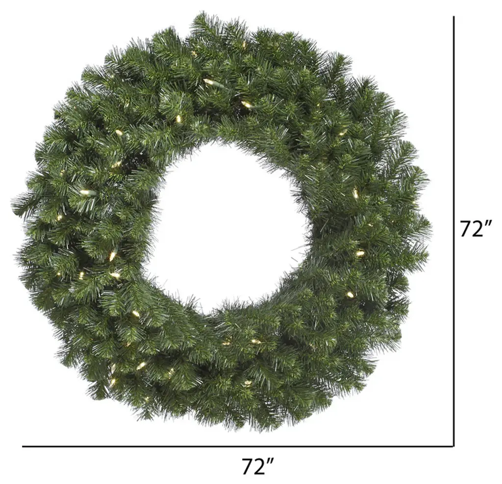 Vickerman 72" Douglas Fir Artificial Christmas Wreath with 1100 PVC Tips and 600 Warm White Italian LED Lights. Add some holiday spirit to your front door or mantle with this beautiful green wreath. This wreath comes prelit with Warm White LED Mini Lights that run on 120V AC and features traditional green PVC tips, giving a lush, full look. The wreath measures 72" across the diameter from the end of one tip to another. This perfect, hard to find commercial sized Christmas wreath is ideal for large spaces. Metal ring construction, Comes in 3 sections; assembly is required, and hardware is included