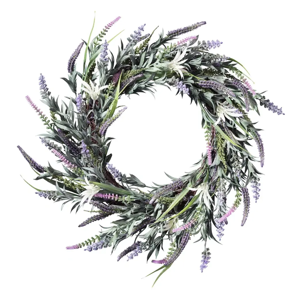 Vickerman 24" Artificial Green Maytime Wreath. Create a statement with this mixed foliage wreath. The purple flowers bring a hint of color into your space