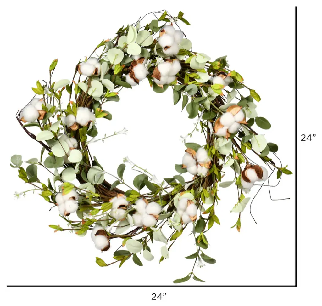 Vickerman 24" Artificial White Cotton Mixed Greenery Wreath. This maintenance free wreath is the perfect addition to your front door or over the mantle. It features cotton blooms and mixed greenery on a natural looking twig base. 45% Polyester, 20% Grapevine, 10% Ethylene