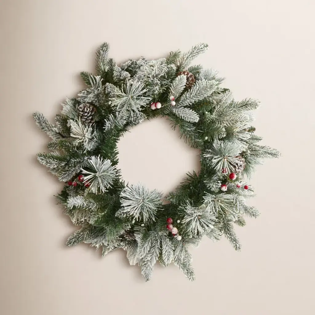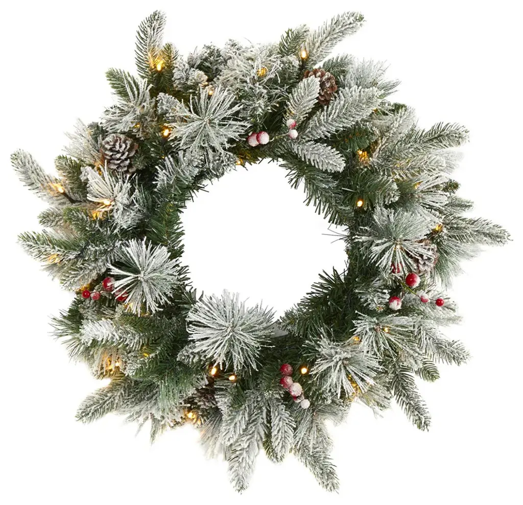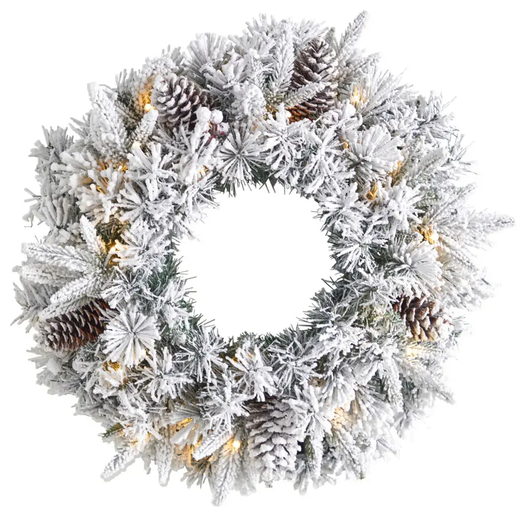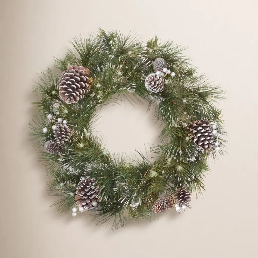 Vickerman 24" Flocked Atka Artificial Christmas Wreath With 91 PVC/Hardneedle tips, pinecones, and 150 Warm White Wide Angle 3mm Low Voltage LED lights. Incorporate bright and modern holiday decor into your space with this beautiful wreath. A great accent for your front door or mantle, this wreath comes prelit with Warm White Low Voltage LED Wide Angle lights that run on 120V AC, and features a beautifully flocked blend of PVC and Hardneedle tips with realistic pine cone accents. The wreath measures 24" across the diameter from the end of one tip to another. This wreath can be used just as it is, or customize it with your favorite ornaments, ribbons, or Holiday picks
