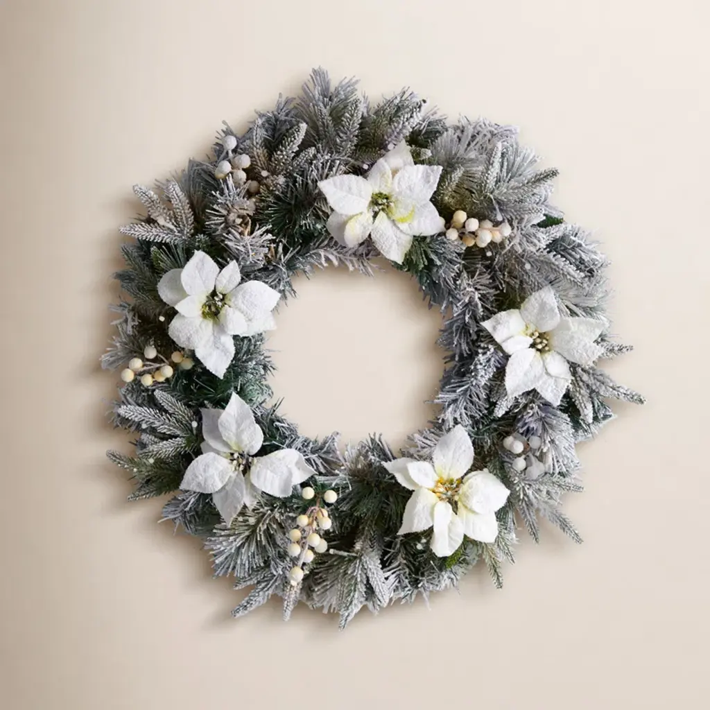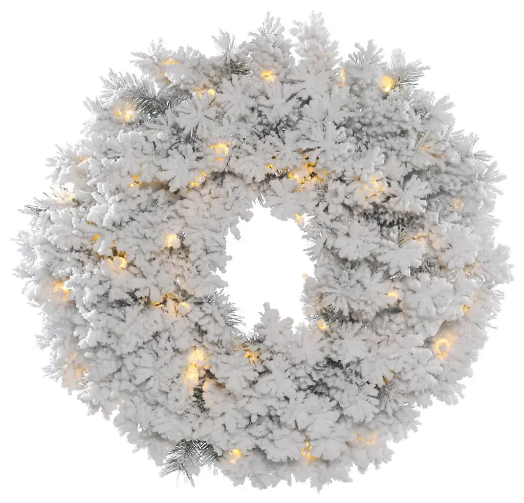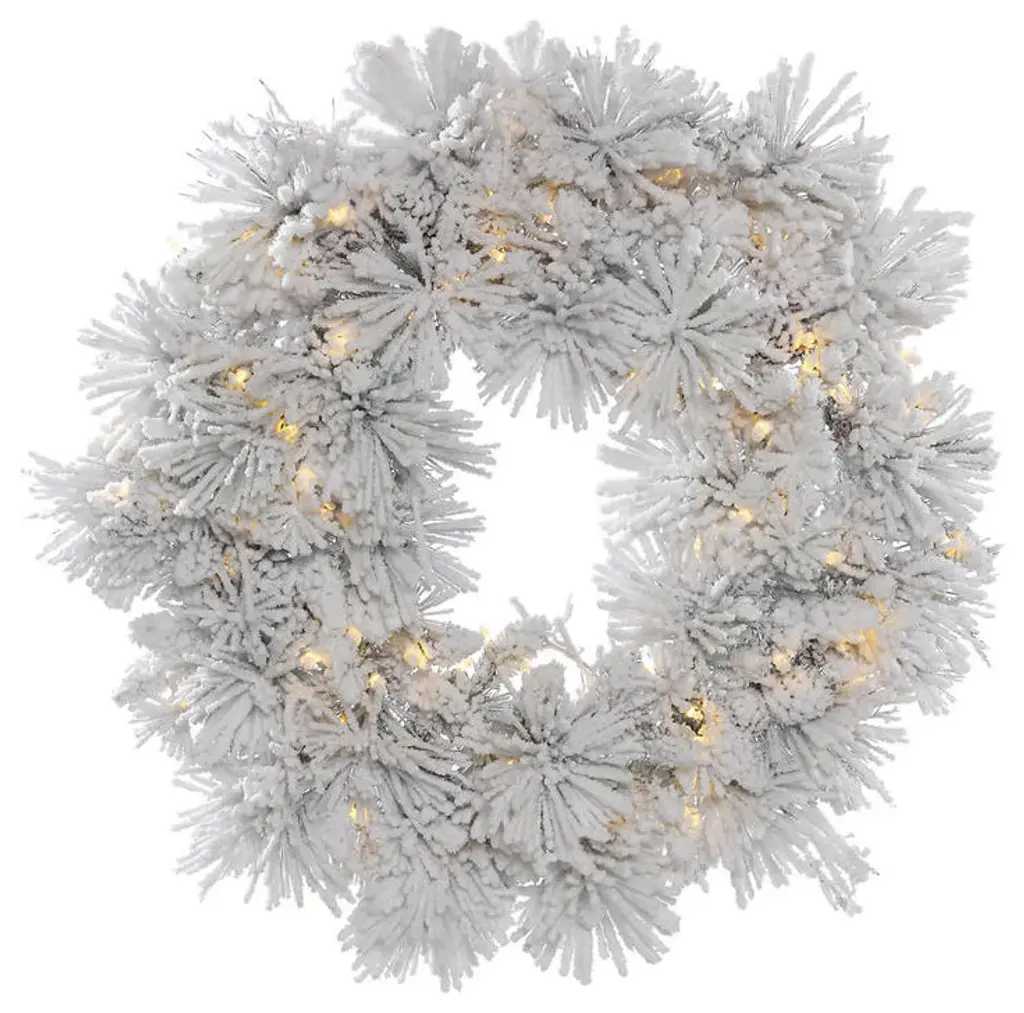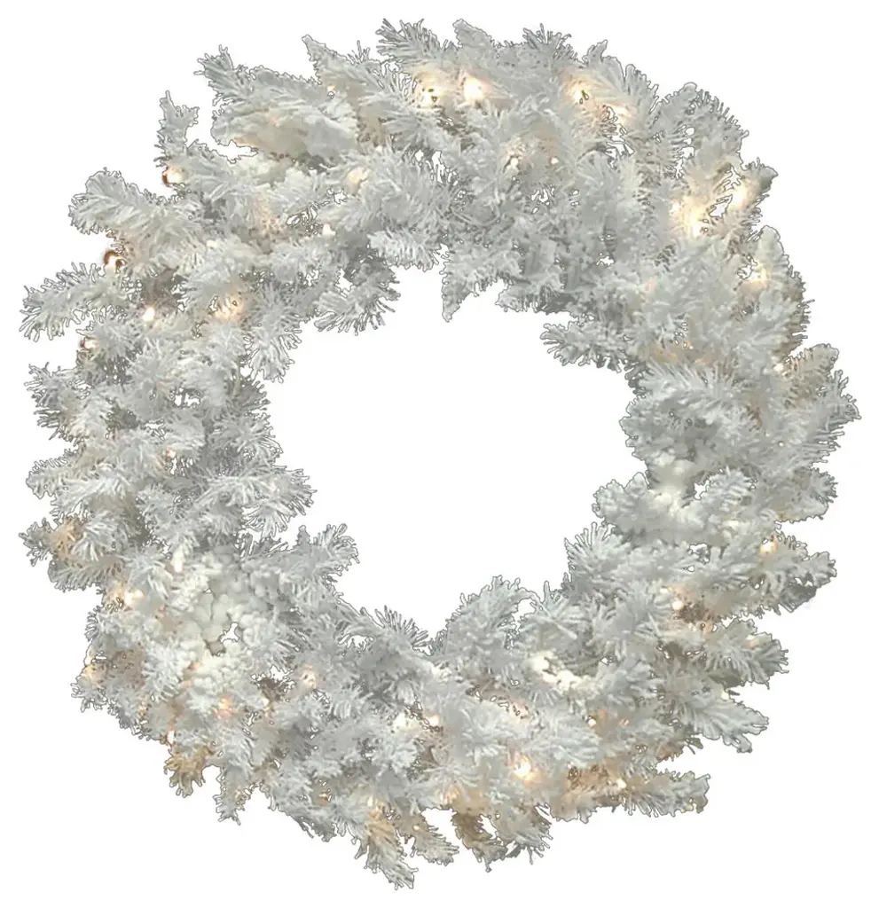 Vickerman 24" Flocked Atka Artificial Christmas Wreath With 91 PVC/Hardneedle tips, pinecones, and 150 Warm White Wide Angle 3mm Low Voltage LED lights. Incorporate bright and modern holiday decor into your space with this beautiful wreath. A great accent for your front door or mantle, this wreath comes prelit with Warm White Low Voltage LED Wide Angle lights that run on 120V AC, and features a beautifully flocked blend of PVC and Hardneedle tips with realistic pine cone accents. The wreath measures 24" across the diameter from the end of one tip to another. This wreath can be used just as it is, or customize it with your favorite ornaments, ribbons, or Holiday picks