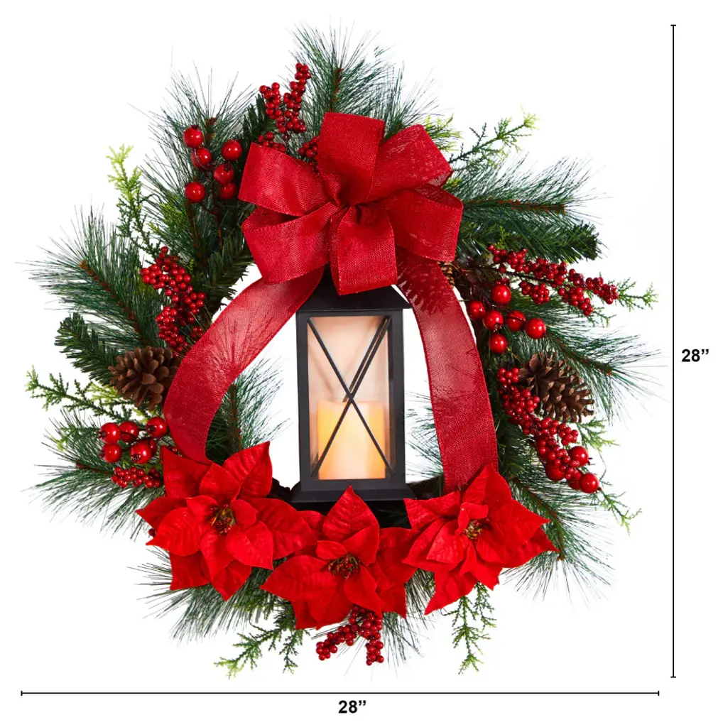 W1272 28 Poinsettia And Berry Holiday Lantern Christmas Wreath With Led Candle
