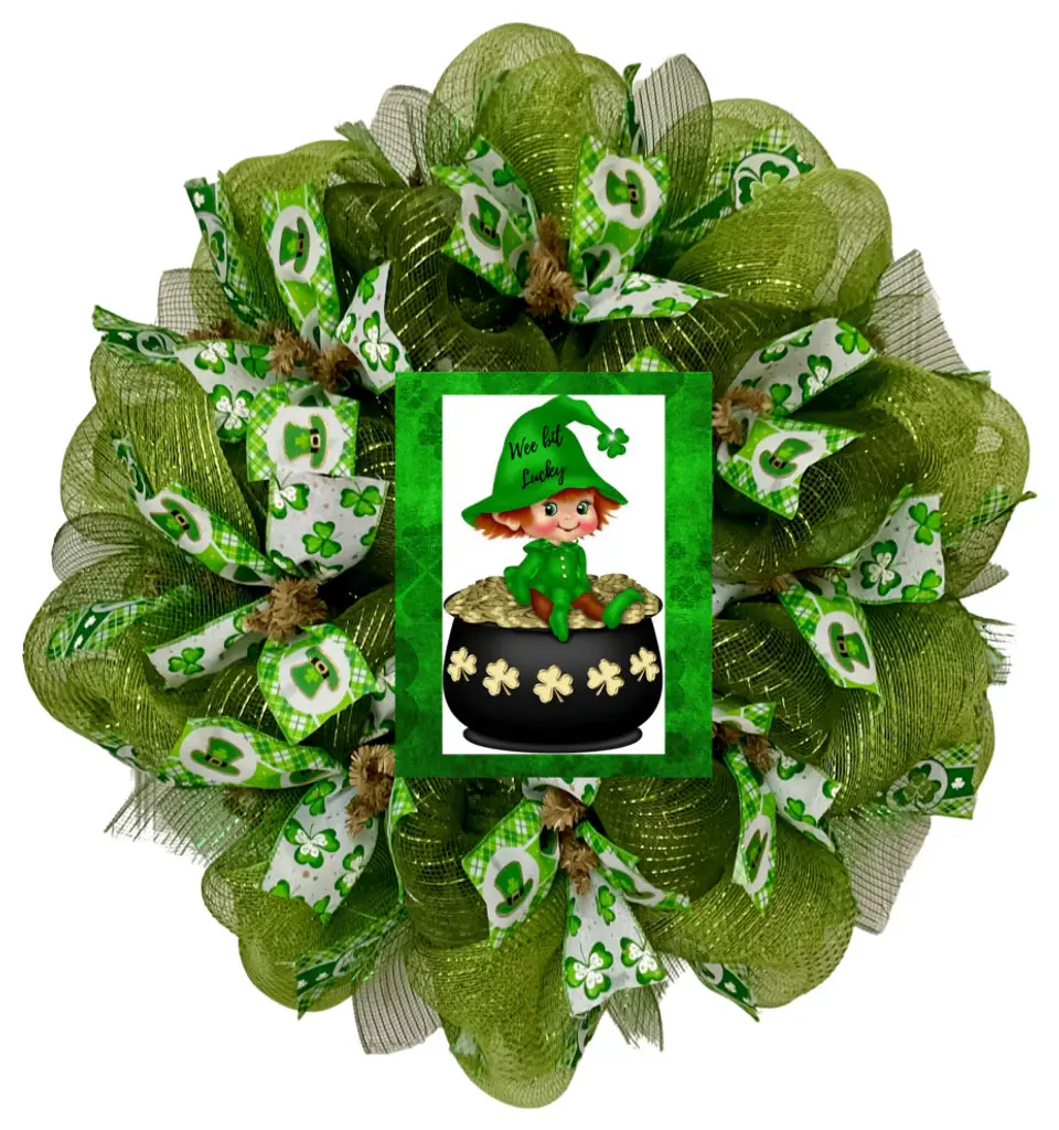 Handmade Deco Mesh St Patrick"™s Day Wreath. A uv protected, aluminum sign rests on a bed of moss green deco mesh. The sign is decorated with an adorable leprechaun sitting in a pot of gold. "œWee Bit Lucky"™ is written in playful script on the leprechauns hat. Leprechaun hat ribbons and shamrock ribbons surround the accent. The outer ring is apple green/moss two tone mesh and has green shamrock ribbons and moss green mesh bows.. The size is 24 inch diameter and a 6 inch depth. Indoor/Outdoor