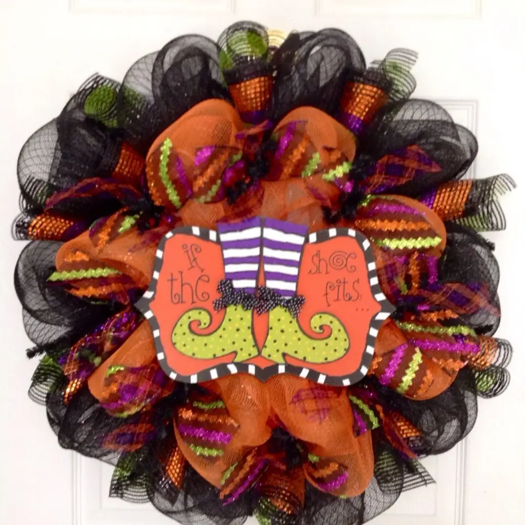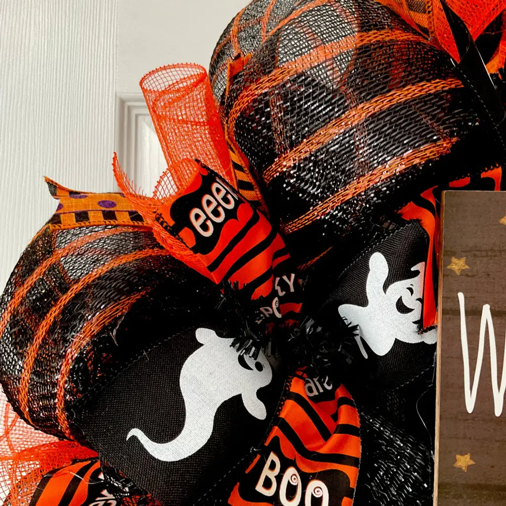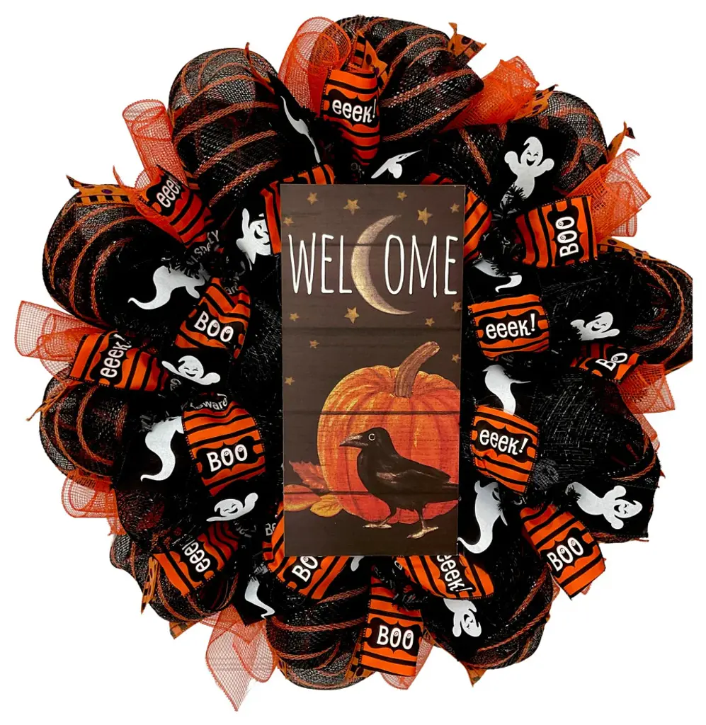 Full! Premium Handmade Deco Mesh Halloween Wreath. The outer ring is made with black and orange striped Deco Mesh. Adorable orange Halloween ribbons with purple dots and orange mesh flutes surround the exterior. .The center of the wreath features a colorful wood Halloween sign featuring a crow and pumpkin along with the wording "Welcome." The sign rests on a bed of metallic black deco mesh and is surrounded by ghost ribbons and Halloween striped ribbons with EEEK and BOO written on them . Great Halloween decoration for doors, windows or walls. Beautiful glittering Halloween colors! The size is 24 inch diameter and 6 inches deep.