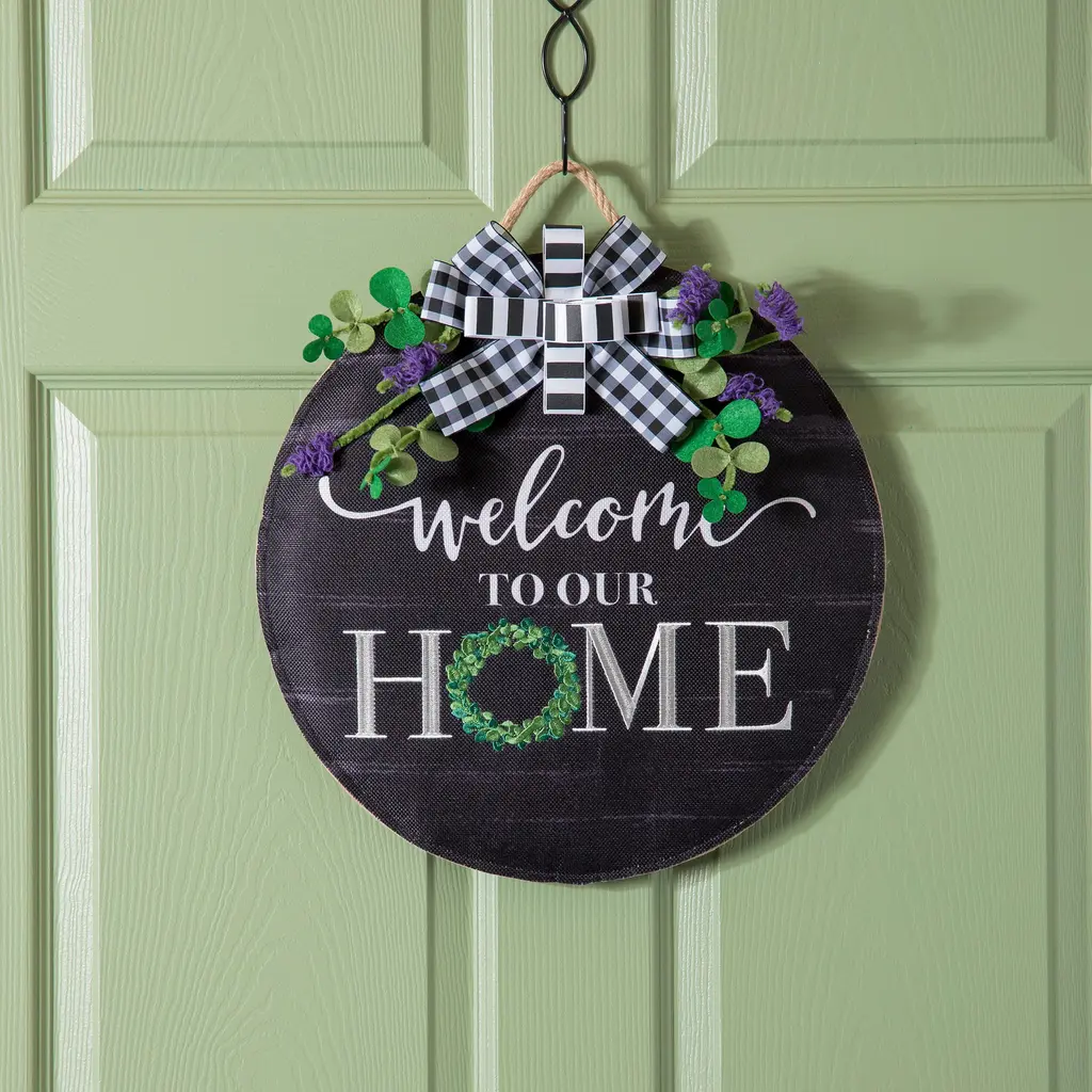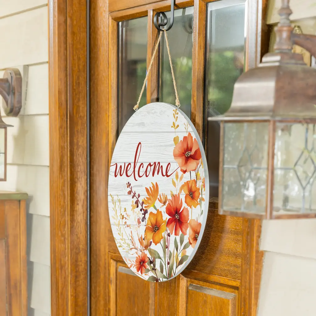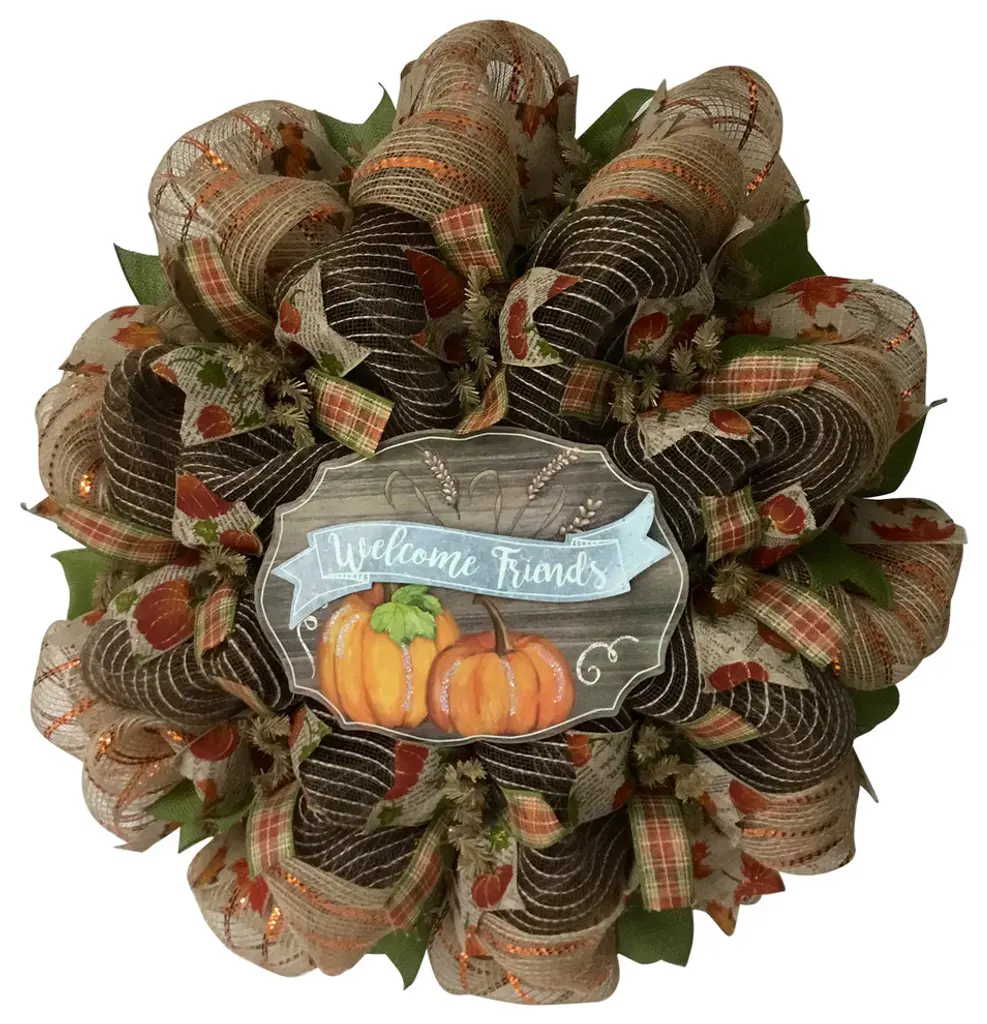 Beautiful Autumn Harvest Deco Mesh Burlap Wreath. This gorgeous wreath is made of soft, creamy burlap deco mesh. The inner ring has colorful autumn plaid ribbons and canvas ribbons with orange pumpkins which rest on chocolate brown mesh with natural stripes. The outer ring green burlap ribbons and beautiful canvas autumn leaves ribbon. The outer wreath is made of natural burlap with metallic orange stripes. The highlight of the wreath is an adorable, wood, scalloped shaped sign which says "Welcome Friends." It is decorated with pumpkins and wheat which have a touch of glitter. The wording is placed on a tin banner and has white lettering. The size is approximately 24 inches in diameter and 6 inches deep. Great Autumn, harvest or thanksgiving addition to your home decor.