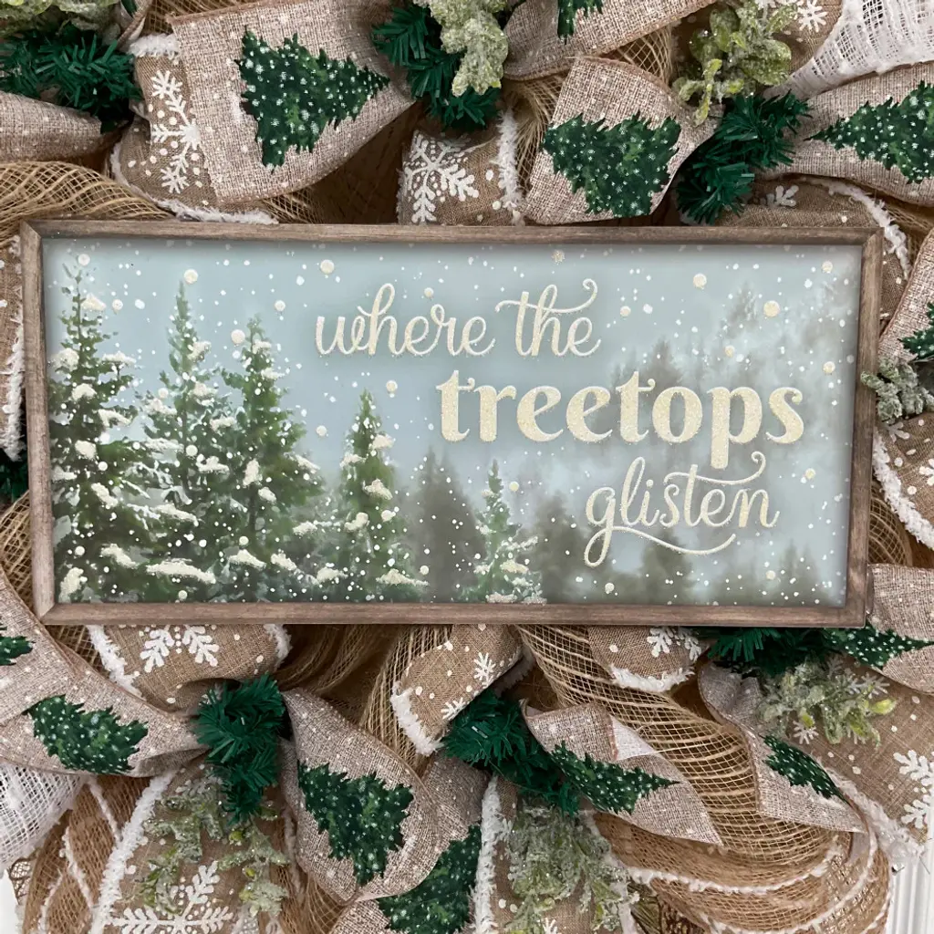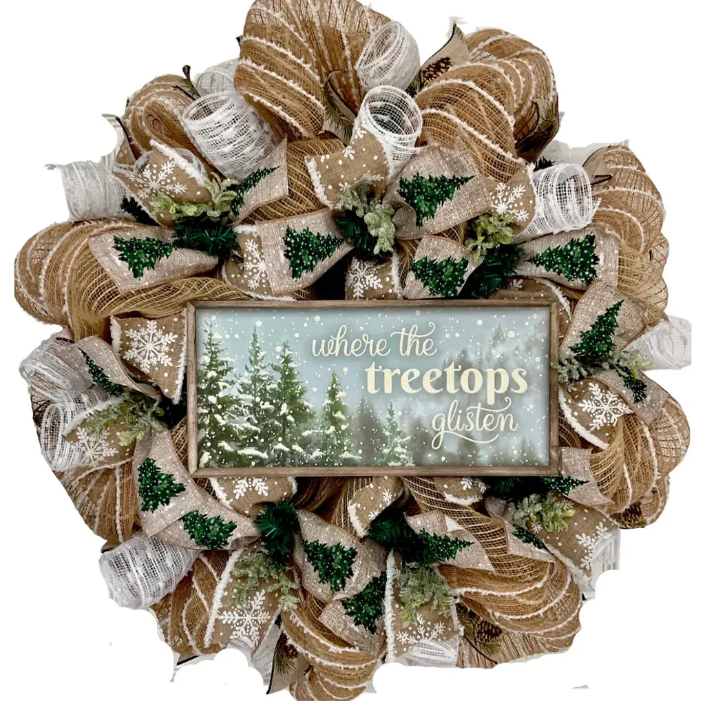 Full, premium handmade burlap deco mesh winter or holiday wreath. Beautiful, wood sign rests on a bed of soft burlap deco mesh. The sign is decorated with treetops and falling snow. The words "Where Treetops Glisten" appear in sparkling white lettering. Gorgous burlap treetop ribbons with falling snow surround the center. Snow capped greenery are placed along the accent. The outer ring is made of burlap mesh with snowdrift cotton stripes. White snowball flutes and beautiful pine cone ribbons surround the exterior. The size is 24 in diameter and 6 inches deep. It is perfect for the holidays and all throughout winter!