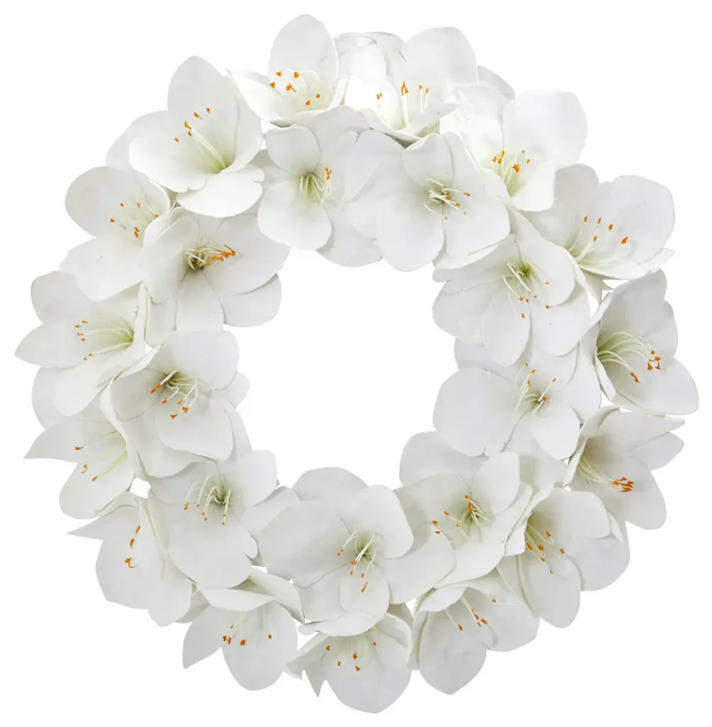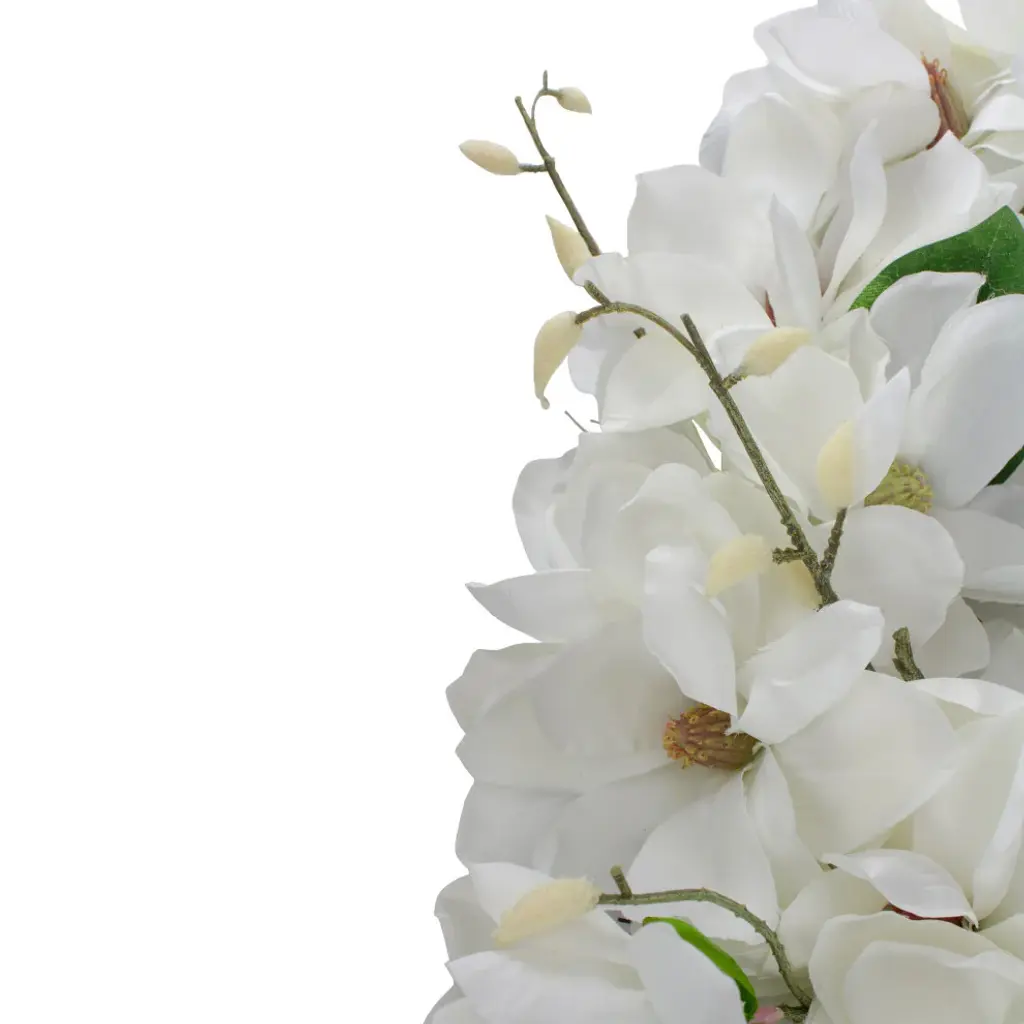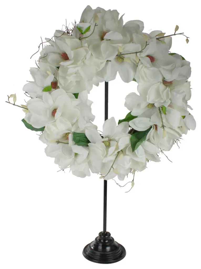 Welcome the changing of the season with this amazing wreath. Covered in white magnolias this wreath is perfect for matching any home decor. Add a strand of warm white lights to create a unique decoration Product Features: Covered in budding or fully bloomed while magnolias accented with leave and flower buds Unlit For indoor use only No assembly required "“ wreath comes in 1 piece Dimensions: 24" diameter (measured from outermost tip/edge to outermost tip/edge across the wreath) Material(s): synthetic