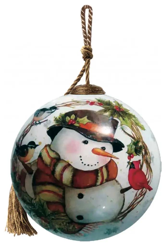 Winter Wreath Forest Snowman Hand Painted Mouth Blown Glass Ornament