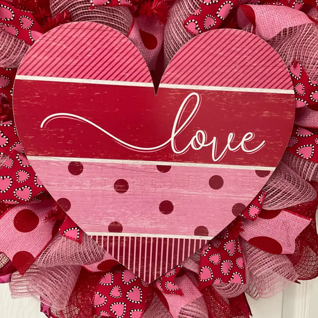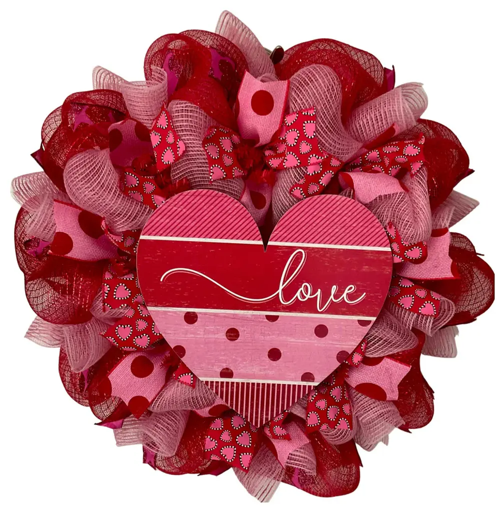 Large, Premium, Handmade Valentines Day wreath. A large, wood, heart rests on a bed of soft pink fabric deco mesh. This accent is decorated with polka dots and has the word "œLove" written in a beautiful script. The inner wreath is decorated with red ribbons with pink hearts and pink polka dot ribbons. The outer ring is made of shimming red deco mesh. Pink flutes surround the exterior along with pink heart ribbons. The size is 24 inch diameter and 6 inches deep.