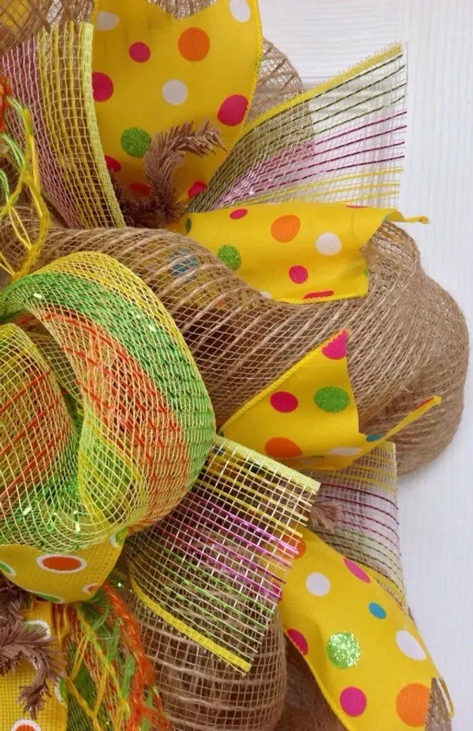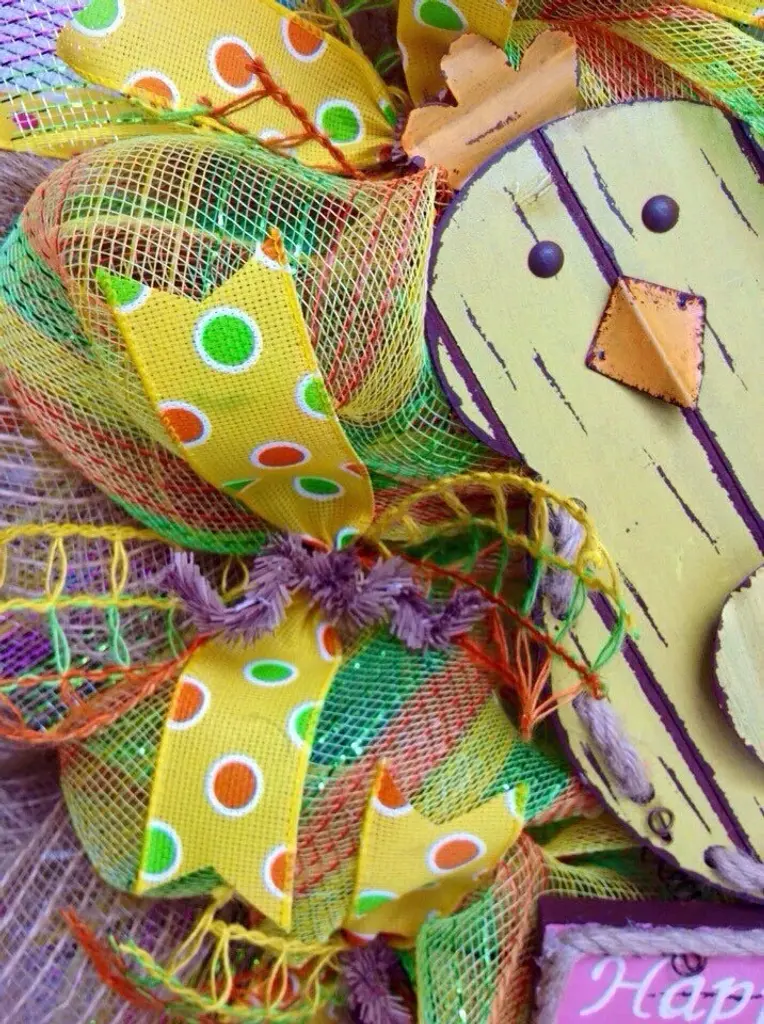 Adorable, handmade deco mesh Easter Welcome Wreath. Large wooden yellow chick with adorable tin beak rests on a bed of bright, shimmering orange, green, yellow plaid deco mesh. The chick is decorated with a rope border and a pretty pink Easter sign dangles below. The center ring has orange, green and yellow window pane netting along with an adorable yellow ribbon with orange and green polka dots. The outer ring is made of creamy deco mesh burlap and features striped yellow, green, pink metallic mesh curls and gorgeous premium yellow ribbons with colorful glittery polka dots. This wreath is perfect for Easter. The size is a very full 24 inch diameter and 6 inches deep.