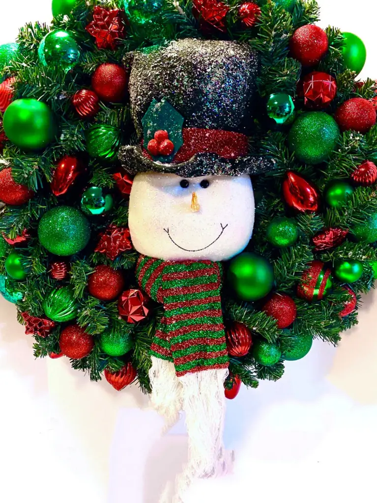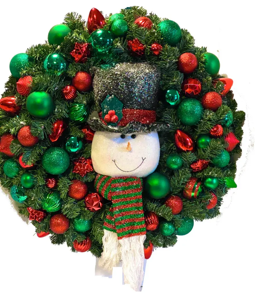 I Ship same day or very next business day! INDOOR OUTDOOR! COMES FROM A SMOKE FREE HOME & SHOP!If you LOVE snowmen, rustic or country decor_��__ Welcome your guests with this ONE OF A KIND Snowman Winter, Holiday Christmas Wreath on a 30_�� pine wreath. I designed this large adorable wreath with the snowman securely glued in. He is surrounded by green pines and red and green shatterproof ornaments. As with all my pieces, every detail is carefully thought out to make this hand crafted wreath one of a kind.I hand painted a mix of clear glue dipped into iridescent glitter to give this snowman and wreath that extra special holiday sparkle! Looks AMAZING with light shining on it! Perfect for indoor or outdoor use!If you are interested in any coordinating pieces, such as a pre-decorated tree, swag, or garland of any size, please feel free to message me.As with all my pieces, every detail is carefully thought out to make this hand crafted wreath one of a kind. Everything is securely wired and/or glued and individually attached and will arrive in just as beautiful condition as you see in the picture! BUY WITH CONFIDENCE! All my wreaths & arrangements are 100% Custom designed handmade by myself, described in full detail with many photos, packed VERY securely for shipping, well taken care of and stored very carefully until sold!Thank you for stopping by!