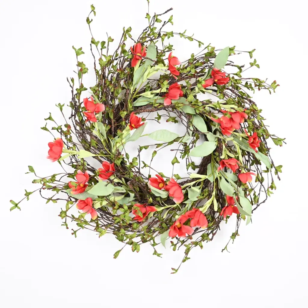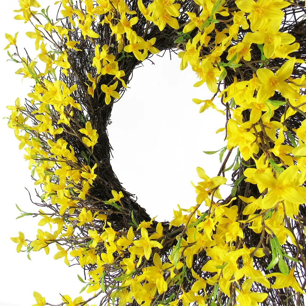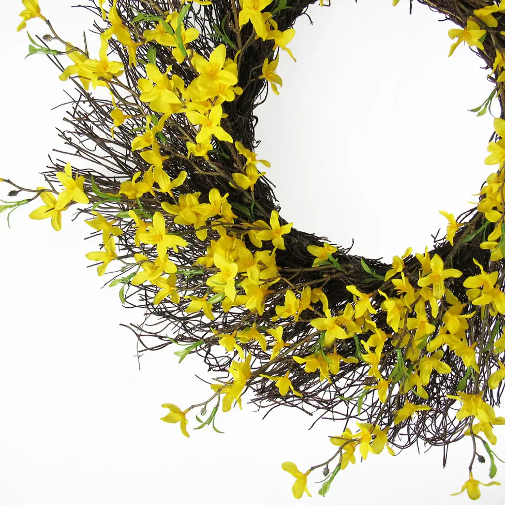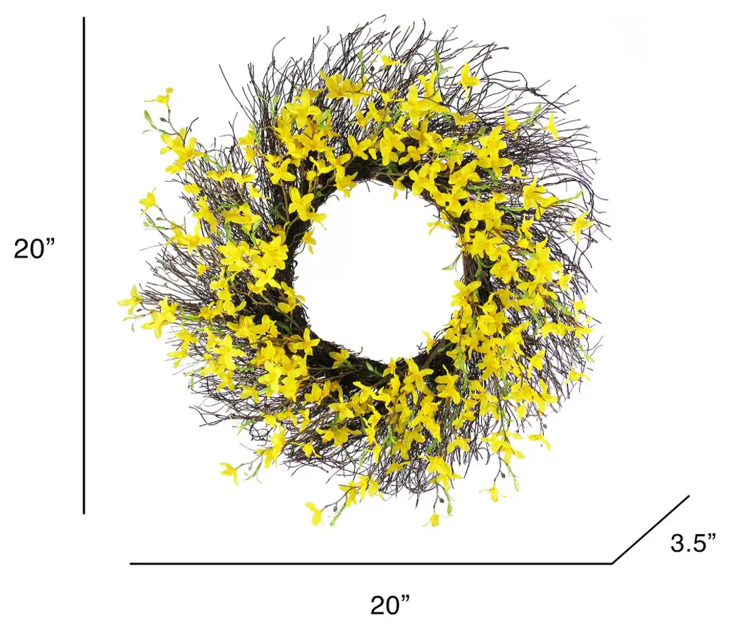 Enjoy this charming and realistic forsythia flower wreath all throughout the year. Easy to incorporate into any home, office, or event setting for a touch of elegance. Features realistic and eye-catching flowers that are hard to miss! Use to quickly add a warm feel to any display, indoor or outdoor. Display as a hanging wreath, tabletop or mantel centerpiece, candle ring, and more. No maintenance, forever fresh! Features:• 20" L x 20" W x 3.5" DP• Twig Ring: 12" D • Forsythia flower sprays accented with twigs, on twig wreath ring backing • Hanging or tabletop use• Best for indoor or covered outdoor usage• Product may ship compressed. Primping of branches or leaves may be required to match the image shown.Images represent actual product, but please understand color may vary slightly due to differences in computer monitor color displays, photographic lighting, or image enhancement.