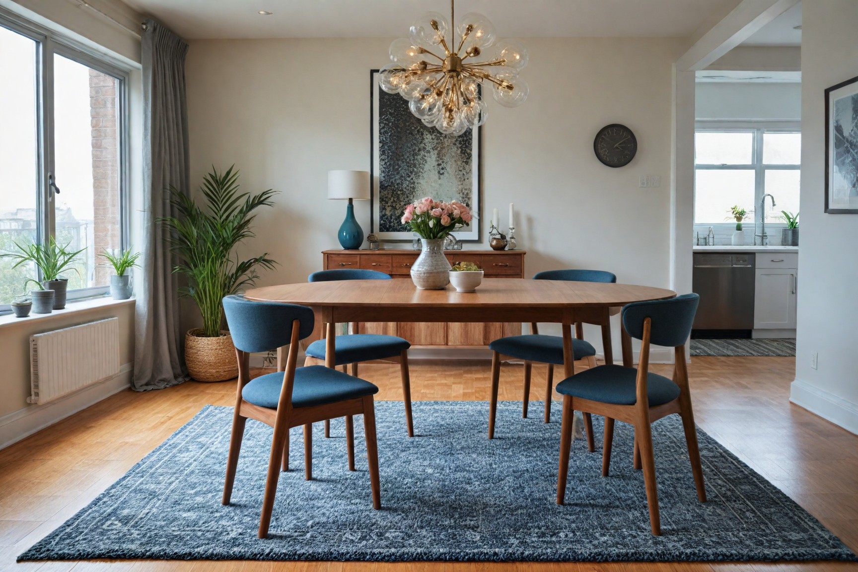 Matching the rug shape to the dining table is key to creating symmetry and balance. Round rugs work best with round tables, while rectangular rugs are ideal for long tables. The rug’s shape should enhance the overall design and flow of the room, ensuring that all elements work together harmoniously.