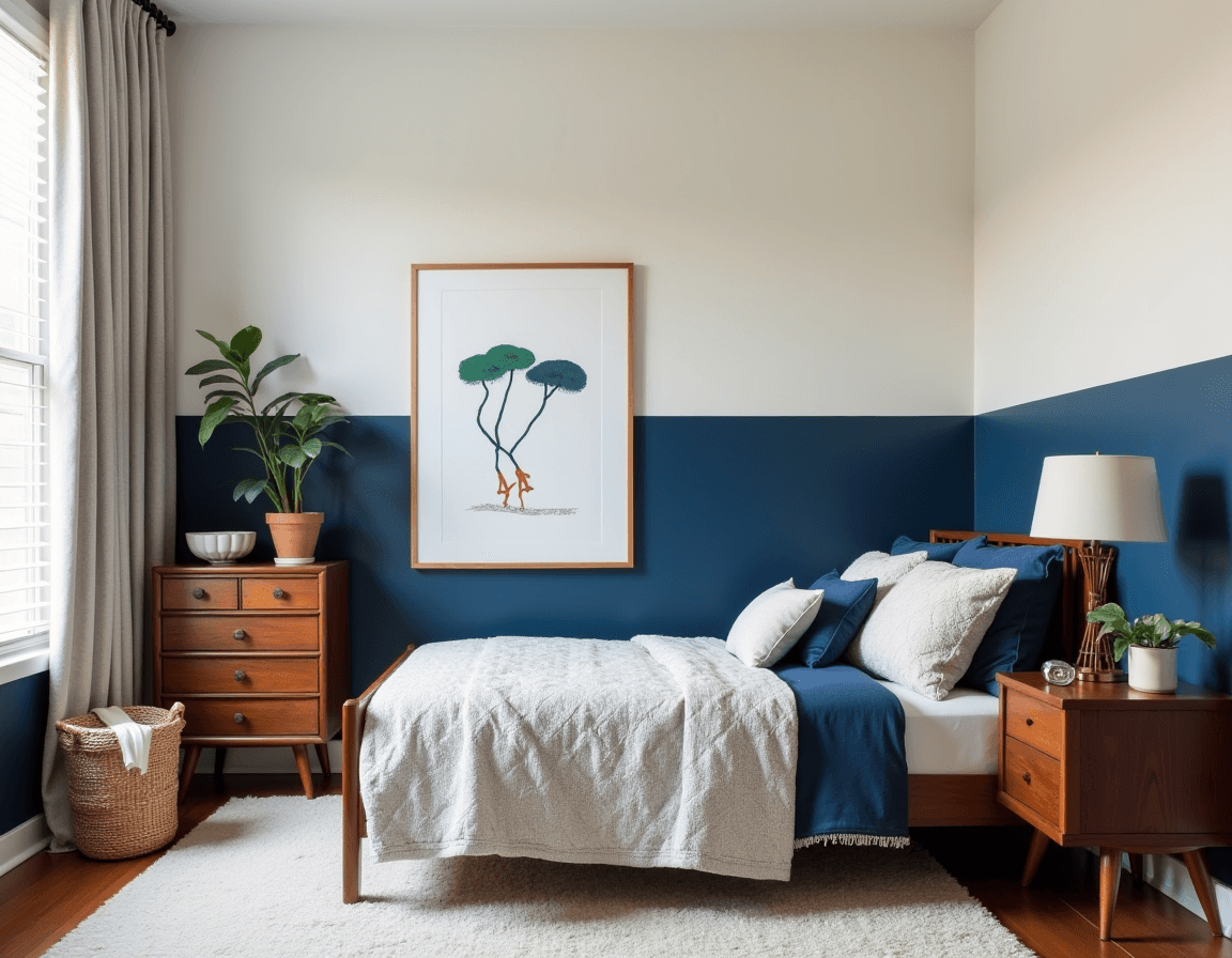 Here’s a teenage boys’ bedroom idea that balances maturity with adaptability. Two contrasting wall colors work just as well for an adolescent as they do for visitors. Deep navy is an iconic color for teen boys, grounded by off-white on the upper half of the wall. A classic mid-century nightstand, dresser, and bed frame in warm wood tones feel grown up — so much so that the room can turn into a guest bedroom without many updates once the kid leaves the nest. Other paint colors, like deep olive and gray, mustard and slate, or orange and beige, will bring the same grown-up appeal.