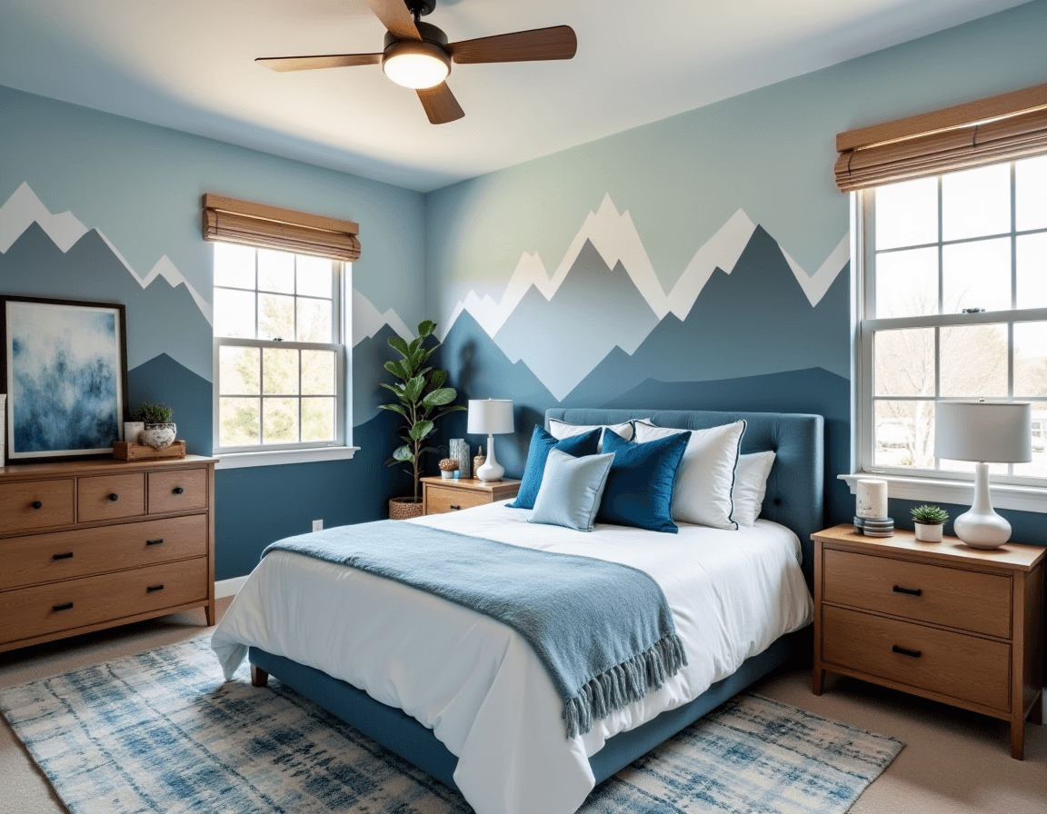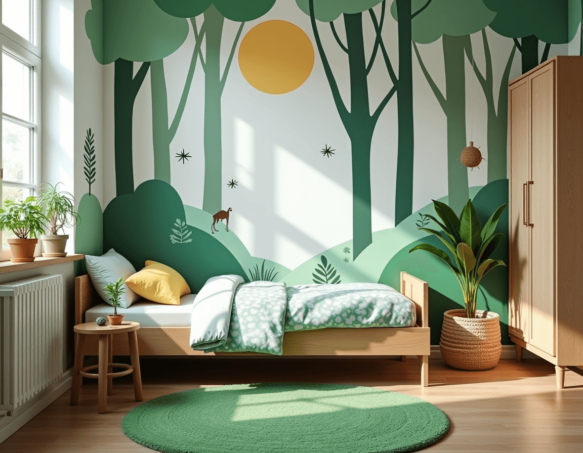 The key to successfully styling a mural wall is to keep the main furniture relatively neutral, so the wall stays the major focal point. Reflect the main colors in bedding and wall art using similar tones. A simple upholstered bed in a matching color and wood nightstands and dressers are flexible options that will work for this mural and whatever comes after. Easy-to-swap layers like bedding, pillows, and throw blankets will also keep up with his evolving taste.