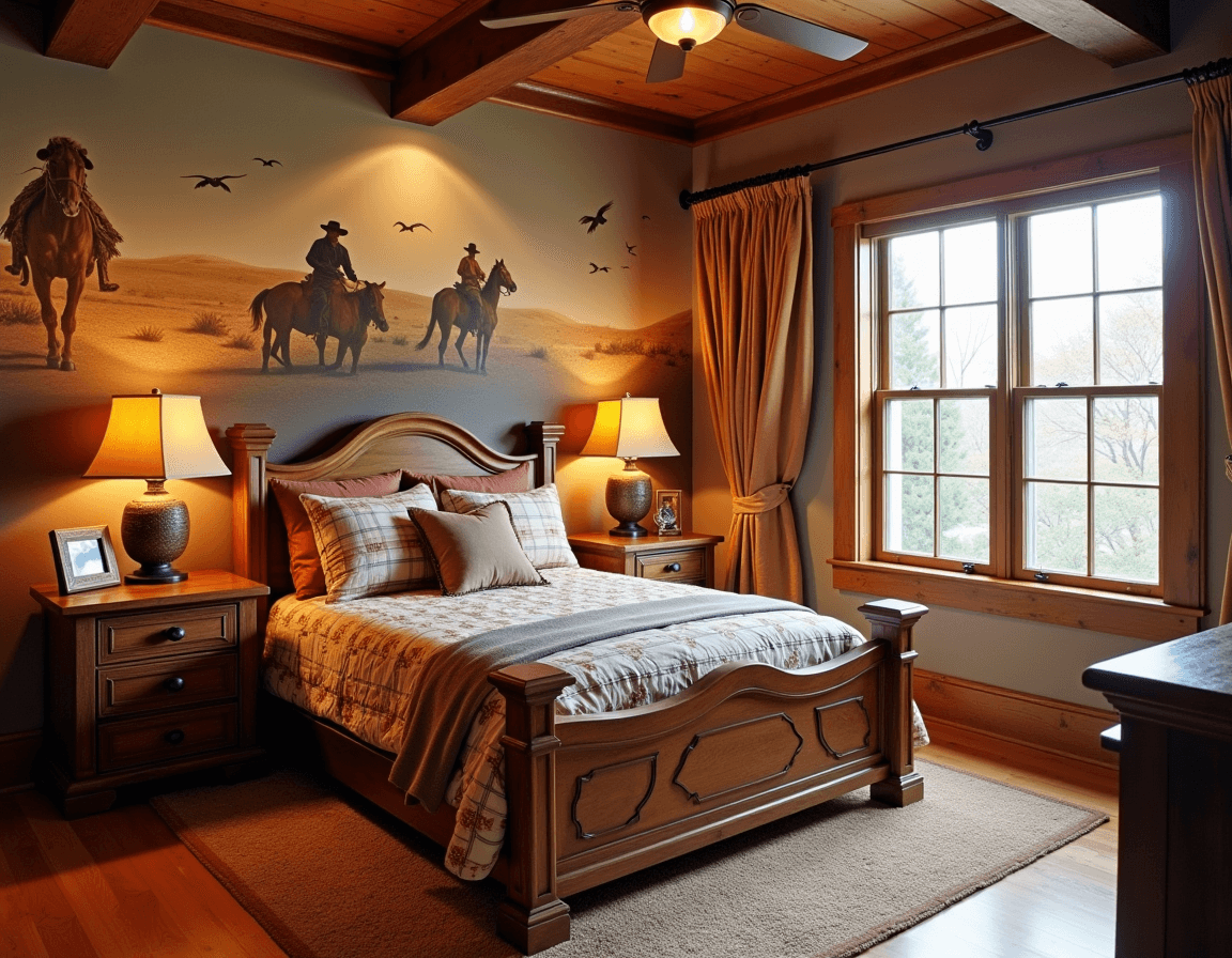 Bedroom walls are where you can get the most creative in a themed bedroom — wallpaper, paint, and decals are relatively quick and budget-friendly updates. A cowboy theme, for example, might start with a desert-inspired mural or vintage wallpaper. For the rest of the room, choose bedroom essentials that will fit the vibe at any age. In that cowboy room, a carved wood bed, terracotta lamps, and a sturdy area rug won’t need to change as the years go on.