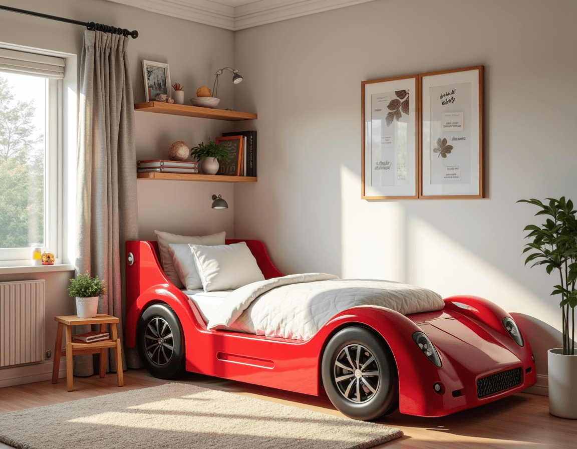 A bed shaped like a convertible is fun, plain and simple. If you want to go bold with a statement bed, keep the rest of the room flexible with classic paint colors, neutral shelving, and simple curtains. Align his room with his latest interests with a Minecraft or LEGO-themed bean bag chair, or choose something more adaptable, like a brightly patterned rug.