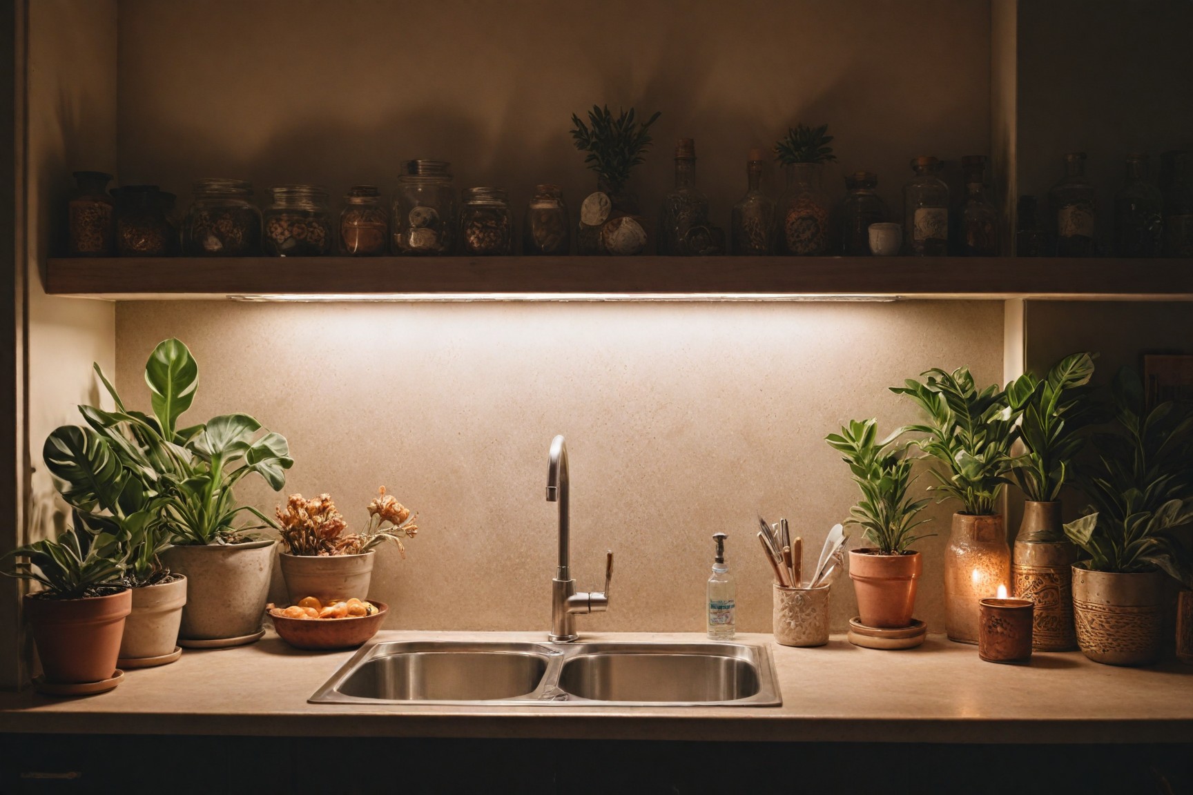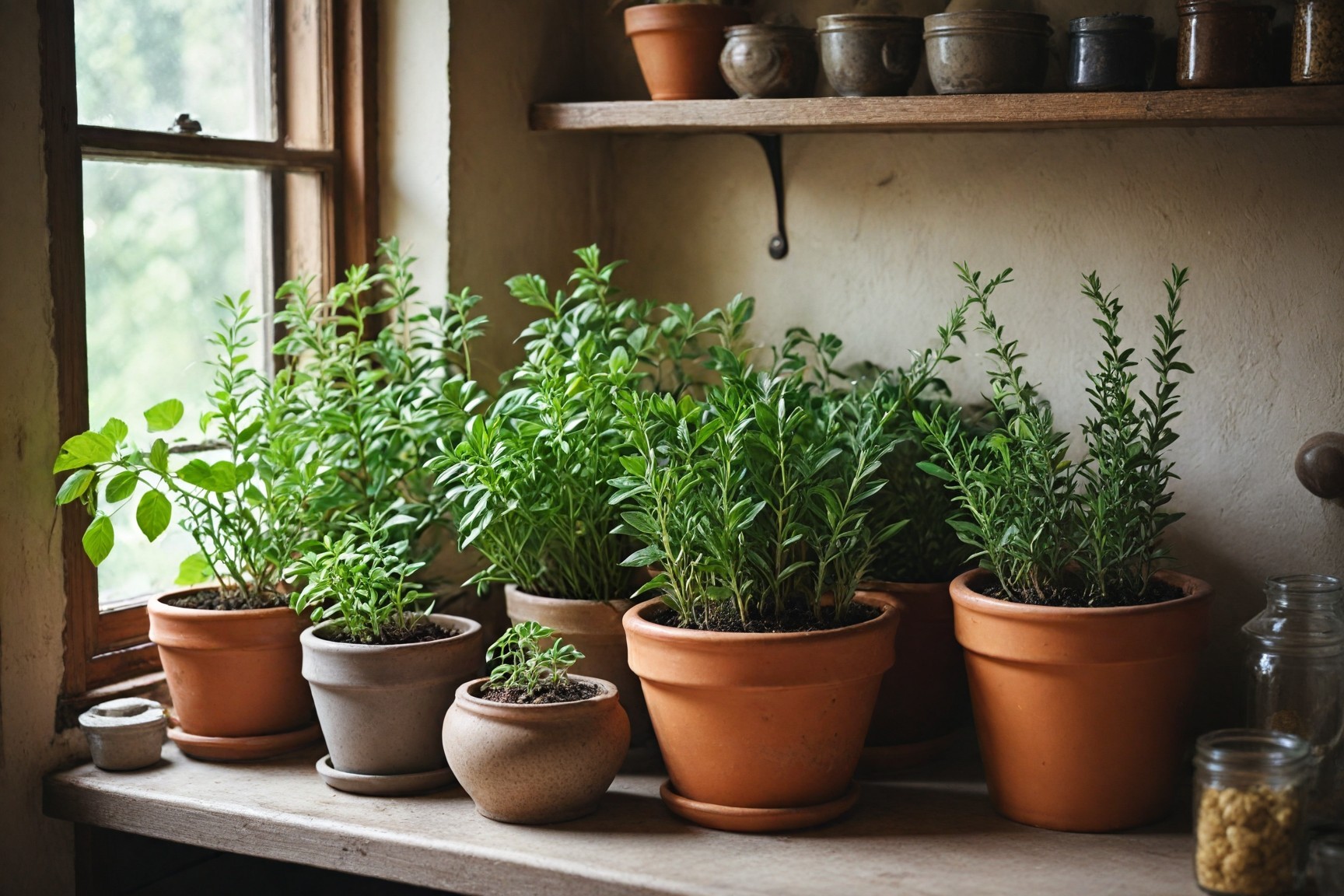 Small indoor herb gardens or planters filled with fresh herbs serve as both practical and decorative elements, adding a lush, green touch to the kitchen's atmosphere.