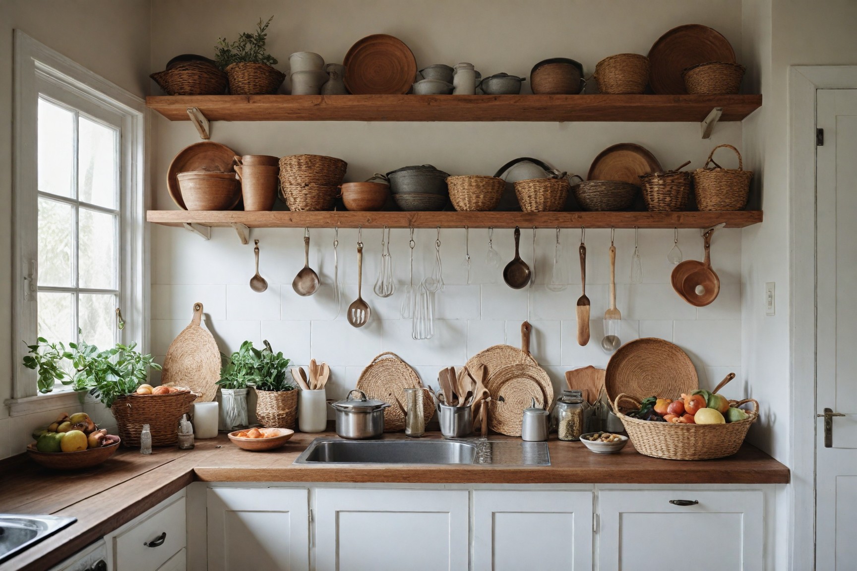 Add woven baskets, macramé accents, and handcrafted utensils for depth and an artistic flair in the kitchen.