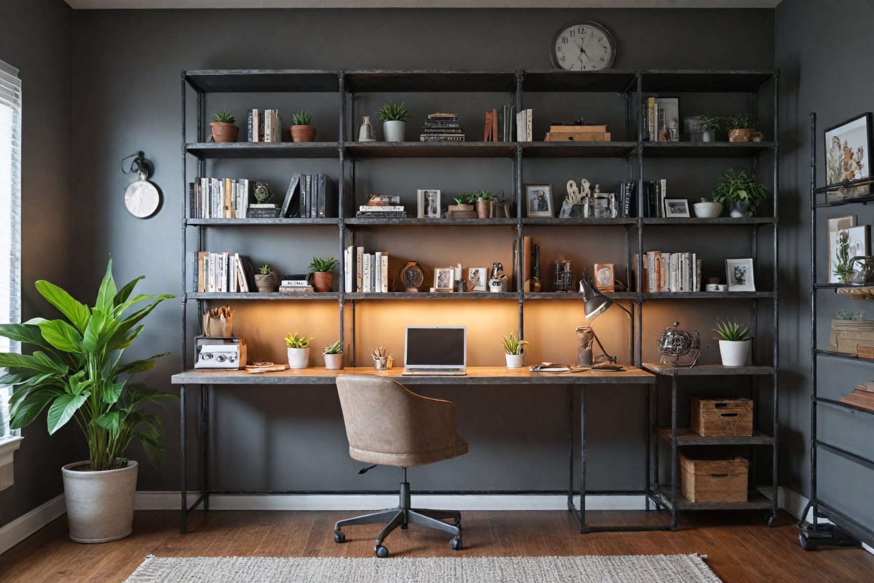 Create a functional and inspiring home office with an industrial twist. Use industrial-style furniture like metal desks and shelving units. Ensure the workspace is well-lit with pendant lights or desk lamps featuring exposed bulbs. Personalize the space with industrial decor, such as metal wall art and vintage accessories, to create a motivating environment.