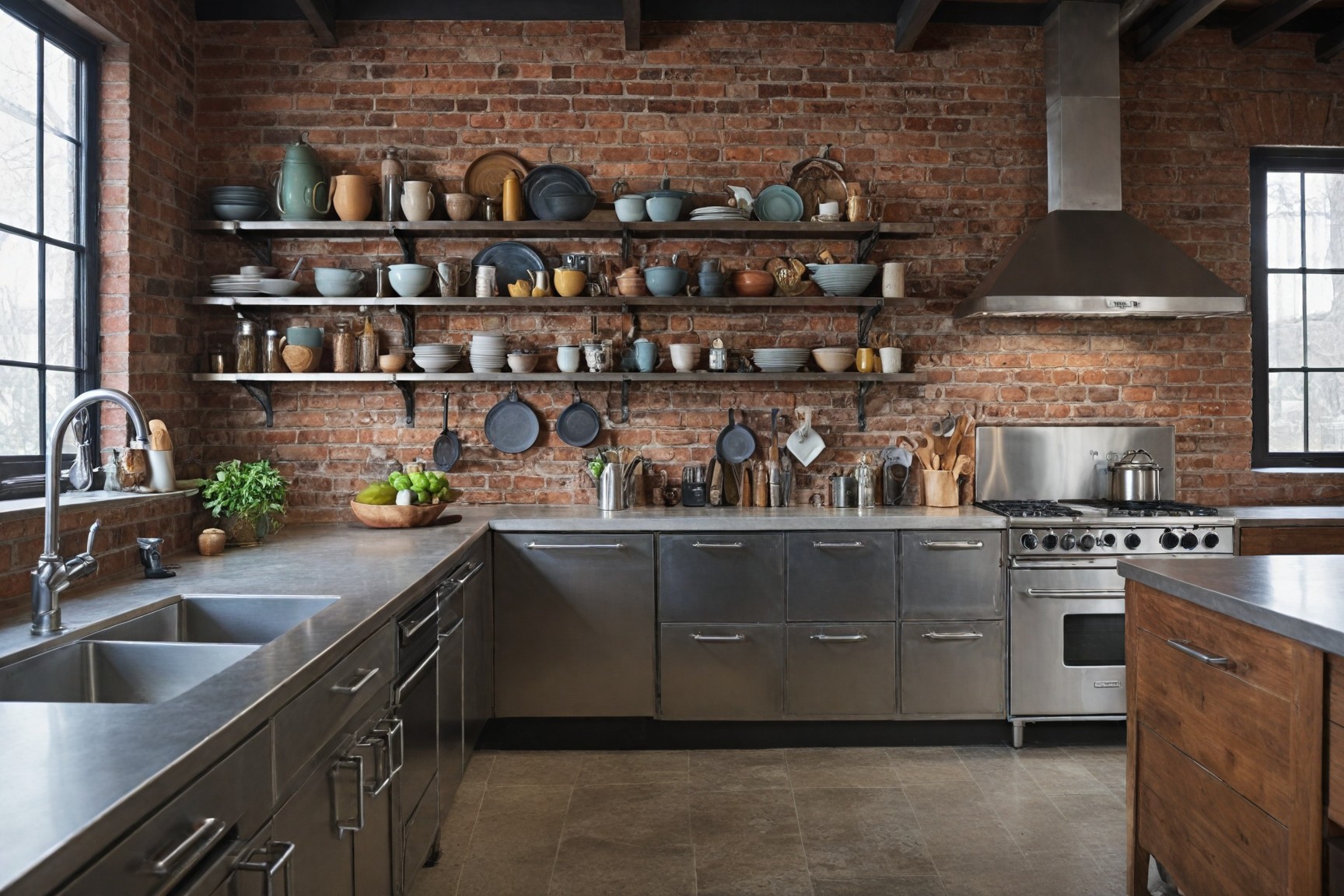 Incorporate stainless steel appliances and iron shelving to create an industrial kitchen. Use metal and wood combinations for cabinets and countertops to add texture and warmth. Integrate exposed brick walls and concrete floors to enhance the industrial vibe while maintaining a functional layout.
