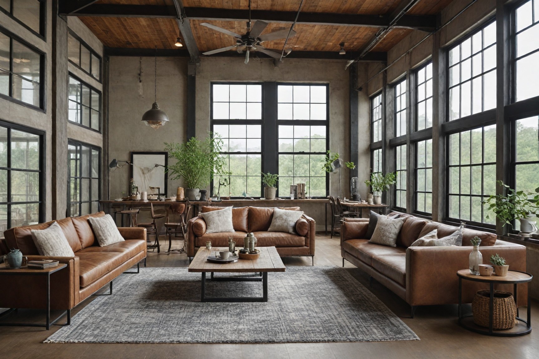 Create a welcoming yet edgy living room with industrial design. Use open layouts and large windows to emphasize space. Select furniture made from metal and reclaimed wood, and add industrial touches like exposed beams and ducts. Incorporate comfortable seating with sleek lines and minimalistic decor to balance the rugged elements.