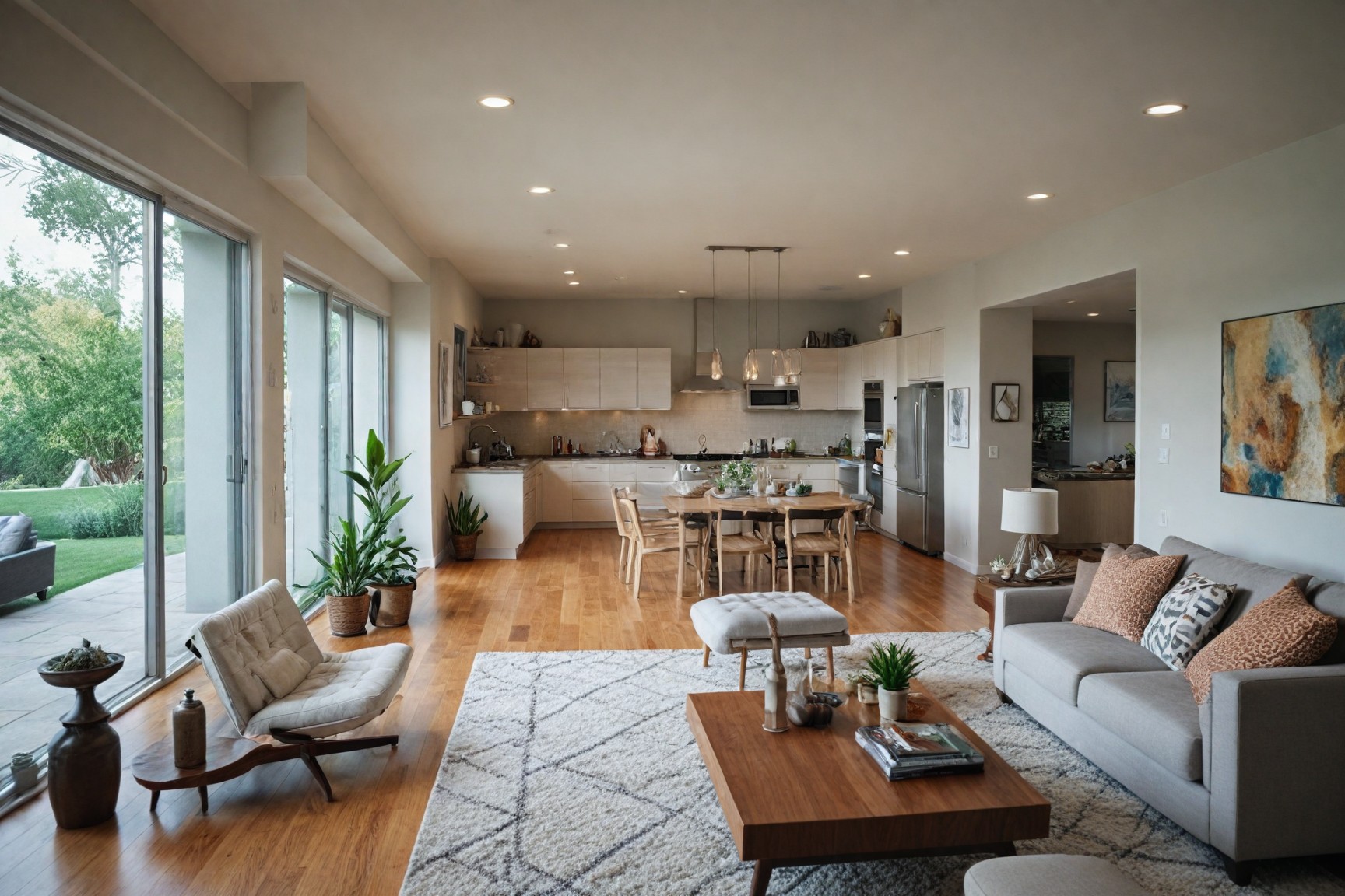 Provide actionable design ideas for applying modern interior design principles across different rooms in a home.