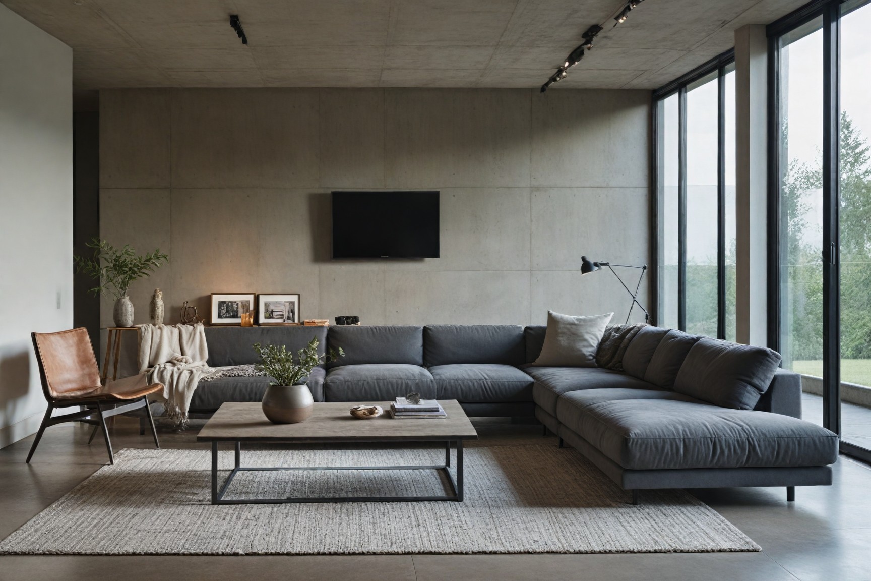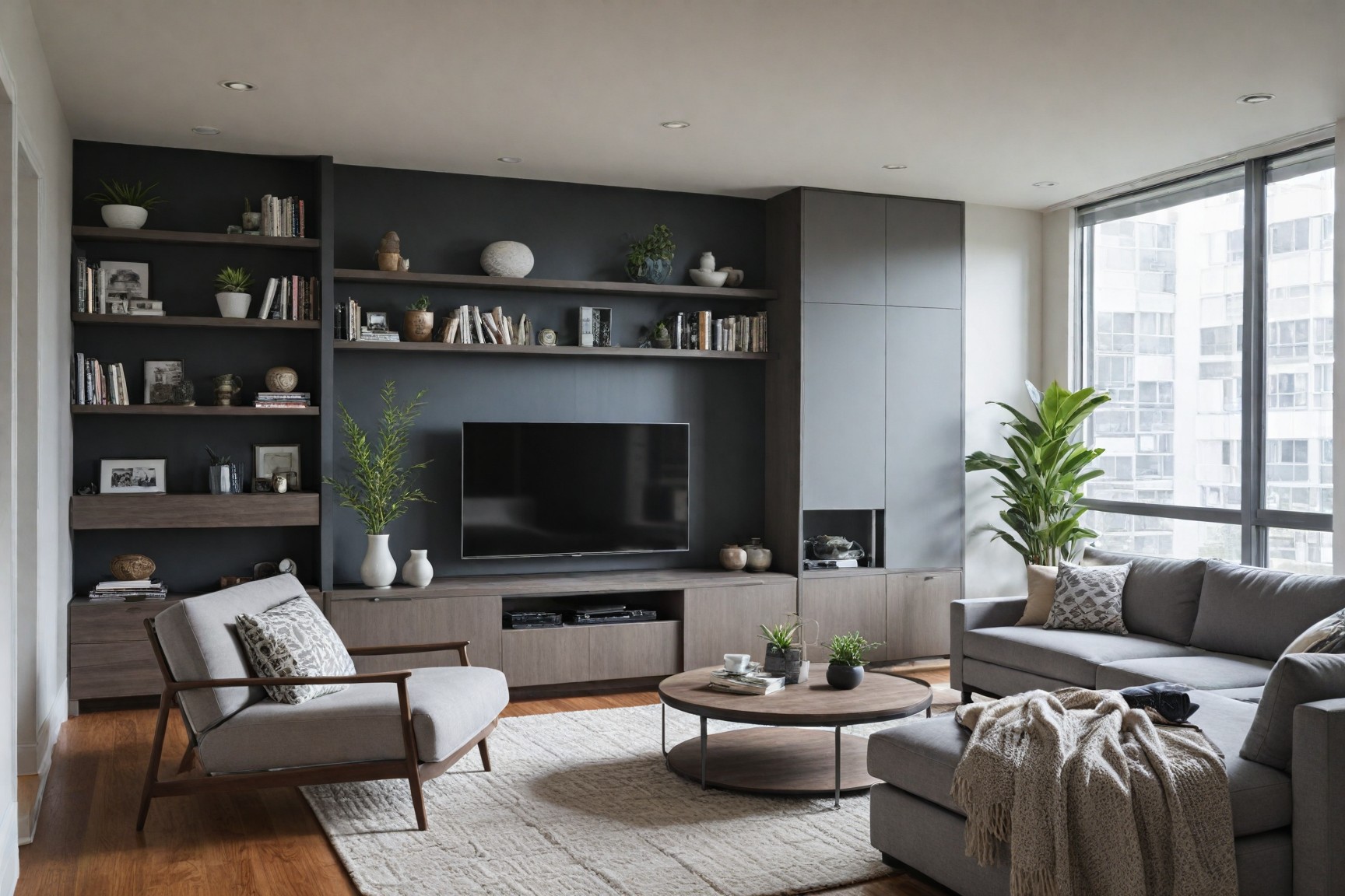 Design a modern living room by focusing on furniture arrangement, decorative elements, and effective use of space for both comfort and style. Use sleek, functional furniture and minimal decor to create a clean, open atmosphere.