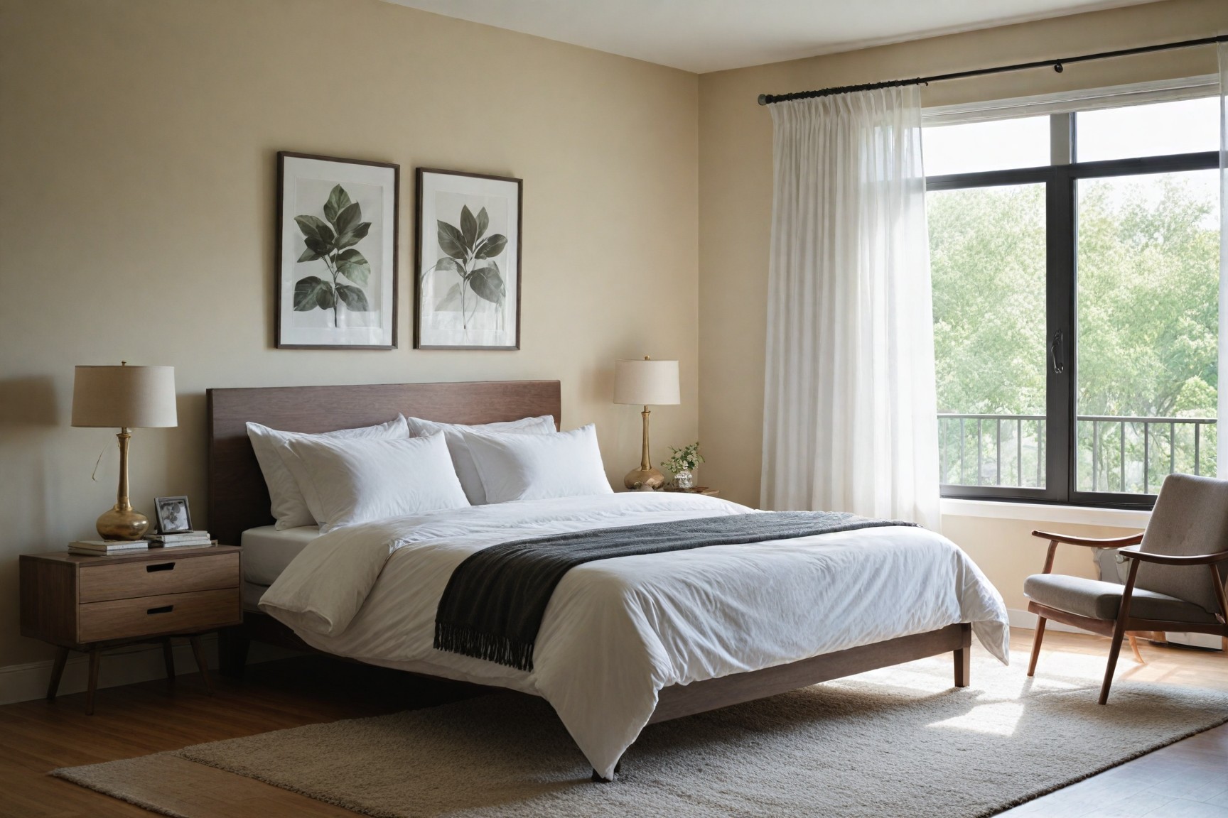 Create a calming modern bedroom by using minimal furnishings and maximizing natural light. Choose neutral color palettes and incorporate simple, elegant furniture to maintain a serene atmosphere.