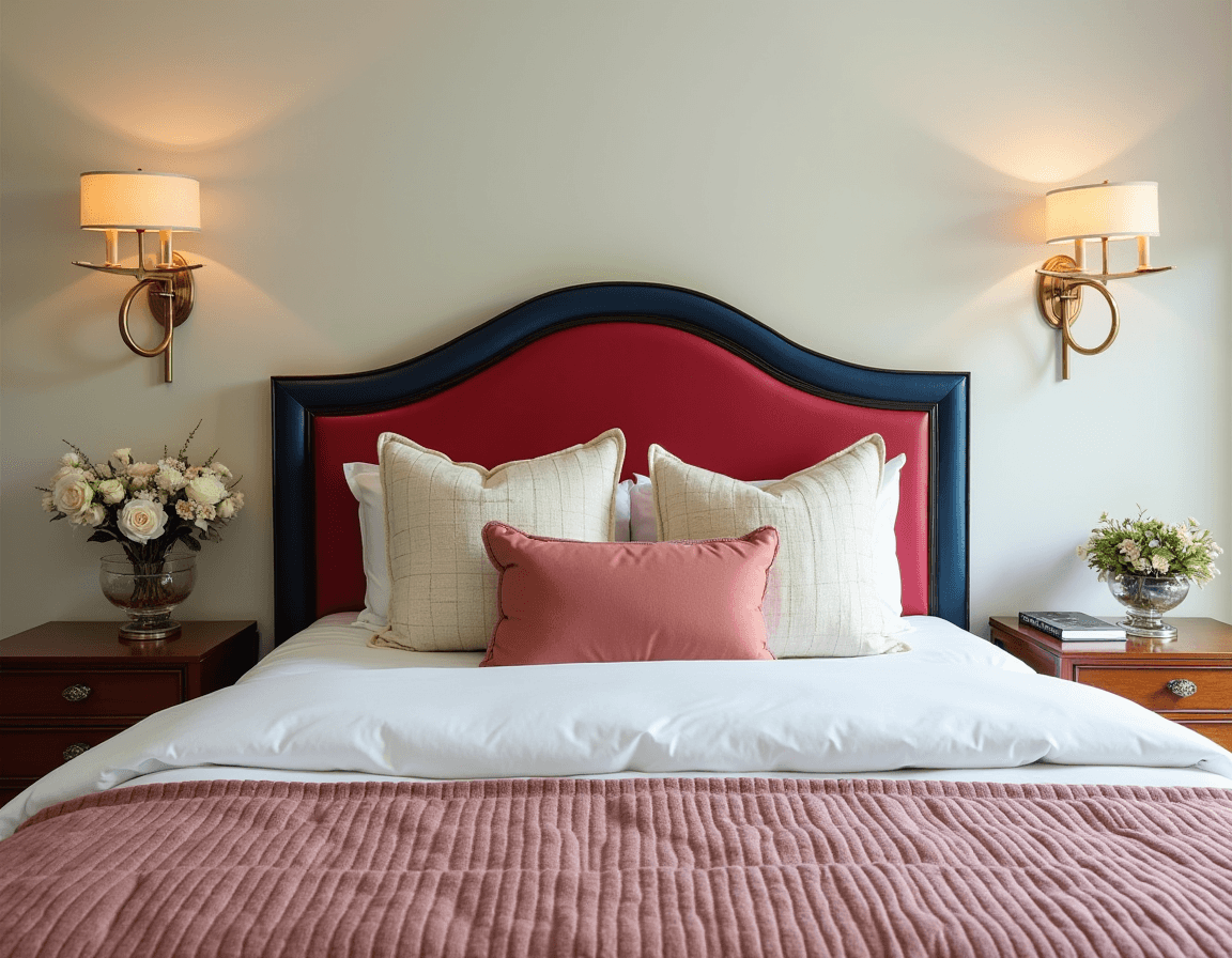 Bedrooms are for rest and relaxation, so naturally you want to attract your attention to the bed. Similar to the living room, this bedroom uses symmetrical placement and subtle color contrast to convince you to take a load off. A bold red and navy headboard immediately grabs your eye, while matching nightstands, flower arrangements, and wall sconces subtly frame everything.