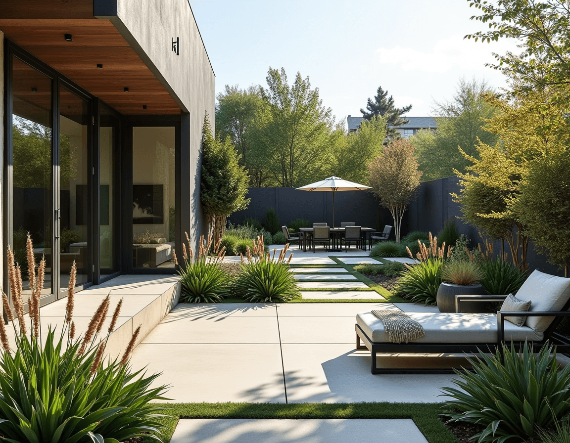 Native plants do more than support the local ecosystem. They also bring in the kind of organic sculptural form that modern landscape design thrives on. In this backyard, structured greenery softens the edges of a minimalist layout, adding movement, texture and dimension to sharp lines. Sculptural shrubs and upright grasses offer visual contrast and feel place-specific, a core principle of modern backyard design.