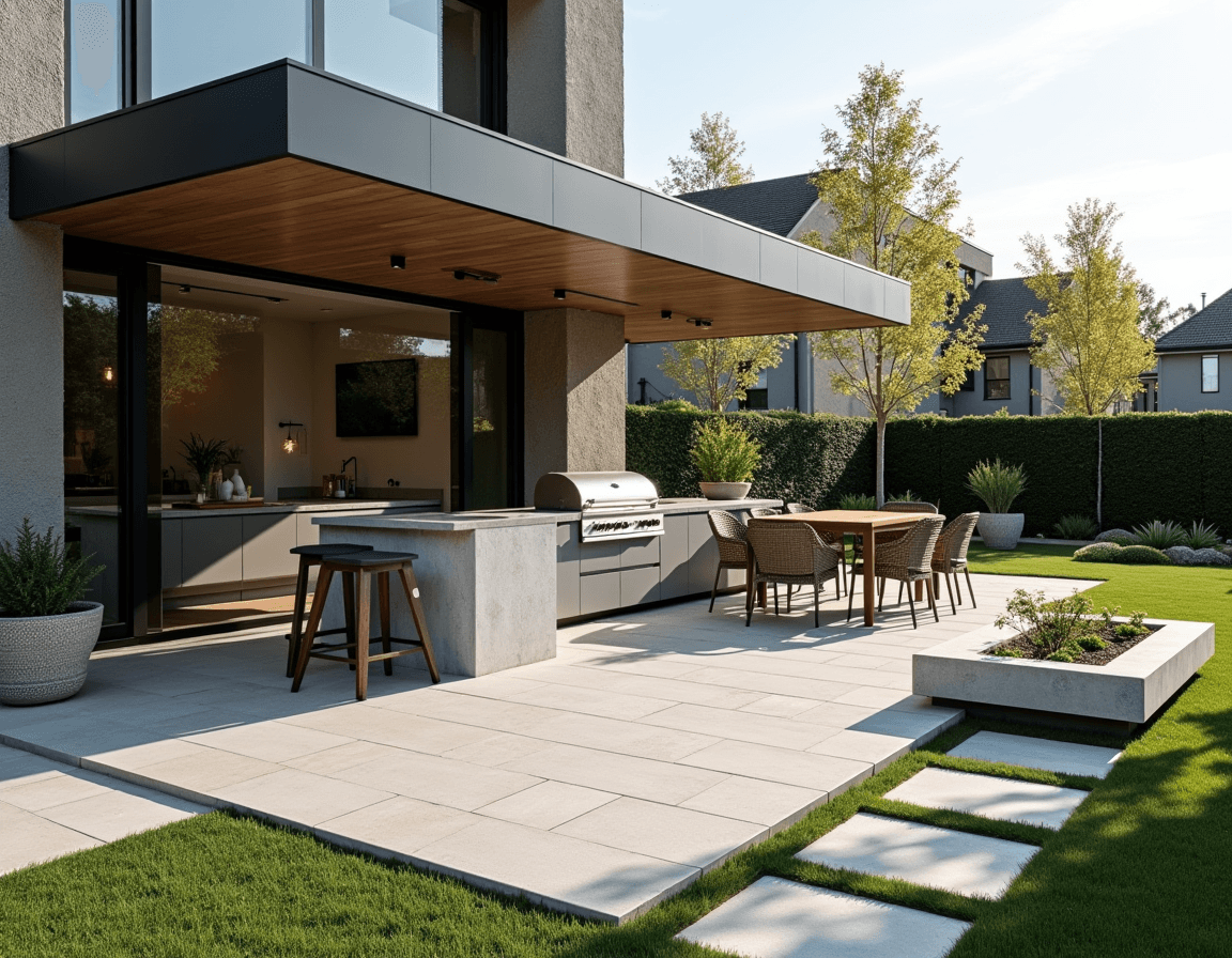 A modern backyard with this much space deserves more than a rolling barbecue and folding table. Here, a built-in outdoor bar and kitchen make the layout feel purposeful — clean concrete, lines that echo the home’s architecture, and generous counter space for prepping and serving. It’s a setup that feels permanent rather than improvised, ready for weeknight dinners and full-on summer parties.