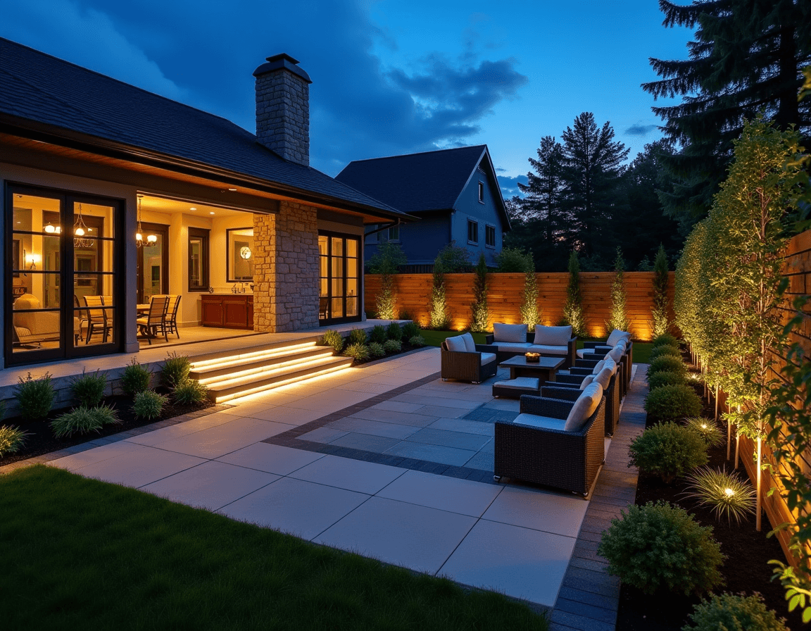 LED lighting is a practical, low-maintenance, and stylish contemporary-modern patio idea. In this backyard setup, horizontal strips are tucked under each stair tread, casting an even glow that improves visibility and highlights the retaining wall and fencing. Path lights work just as well along walkways or around a seating area, defining the layout and making the yard easier — and much safer — to navigate after sunset.