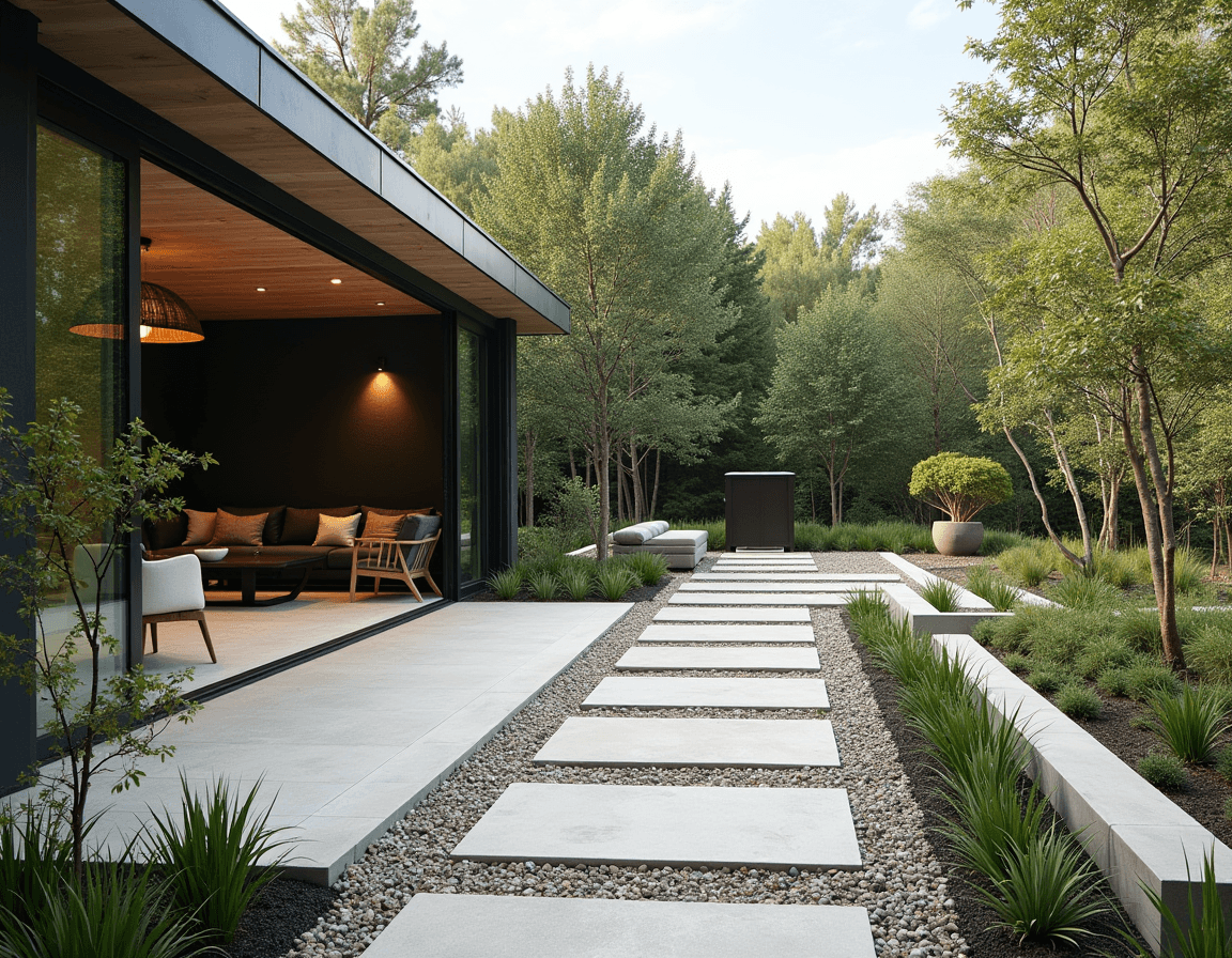 Few materials work harder than concrete in a well-designed outdoor space — it’s strong and quietly stylish. In this setup, concrete pavers carry through from the indoor-outdoor seating area to create an open, modern foundation that unites both spaces. Inside, the generous lounge setup, with its couch and coffee table, feels like part of the backyard design thanks to shared materials. Outside, the path extends toward a tucked-away daybed. It's a smart modern garden idea for creating a quiet zone to read, relax, or soak up the sun.