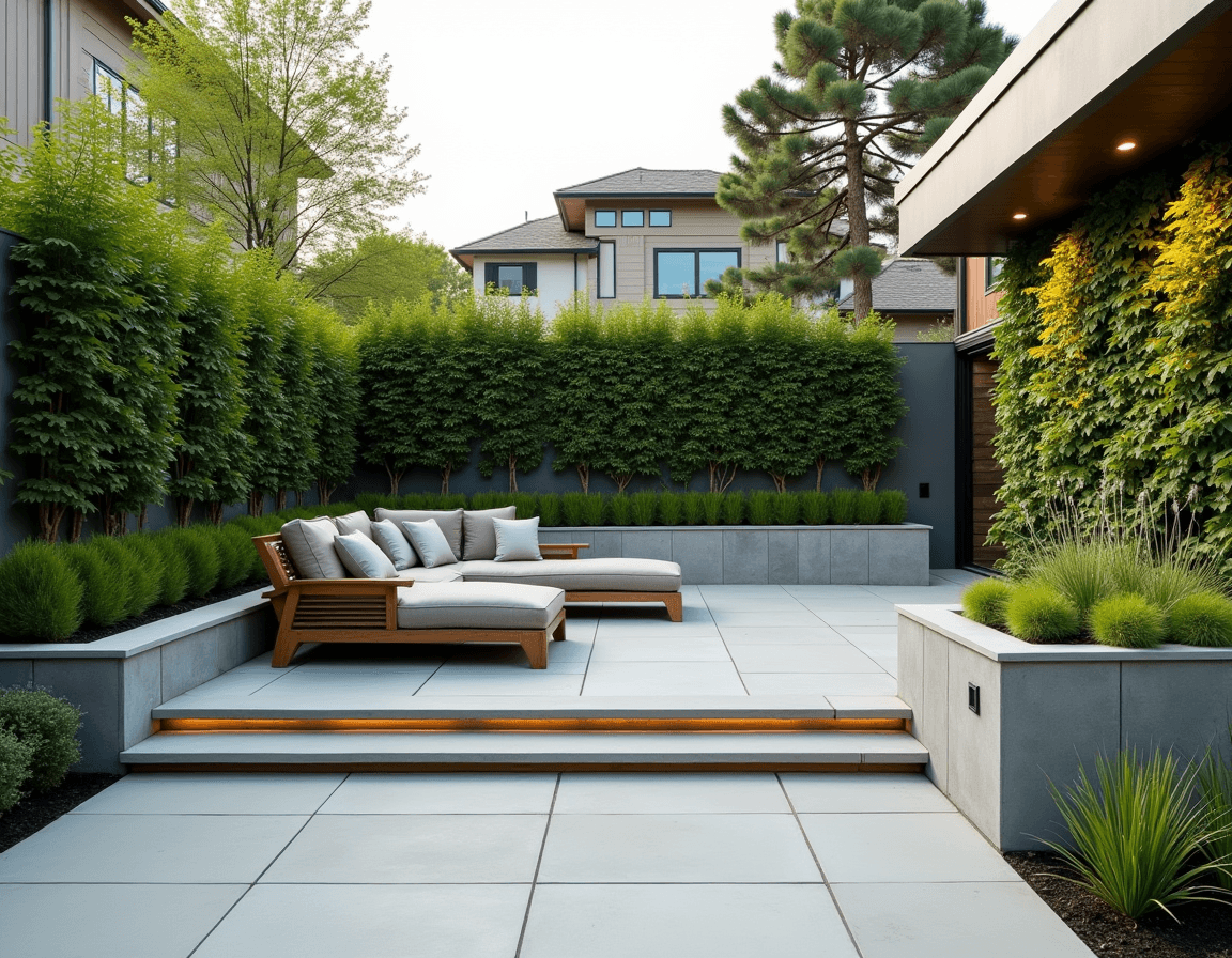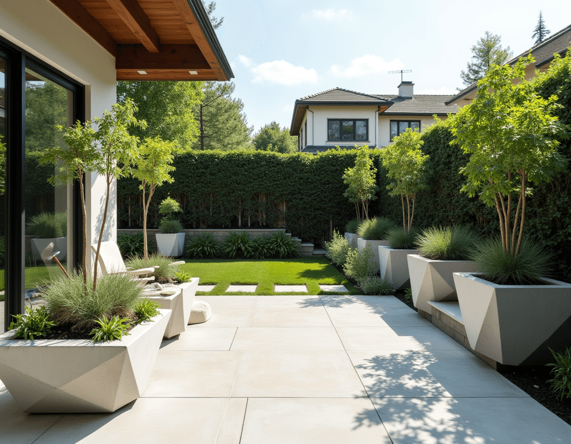 These concrete planters add shape and structure to the small patio area, an ode to clean lines and crisp geometry. Paired with upright greenery, they create a vertical moment that feels modern and intentional. Tall grasses, native plants, and flowering shrubs work well here because they add height without spilling over and hiding the planter. It’s a polished, modern, small backyard idea that elevates any patio or seating area.