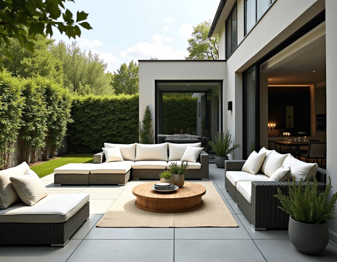 Modular furniture like this can be rearranged to suit your backyard's layout, which is especially helpful in small spaces or narrow side yards. An outdoor table or fire pit, a natural fiber rug, and a few throw pillows help create an inviting seating area. The result is a flexible setup that works well for both everyday lounging and weekend gatherings.