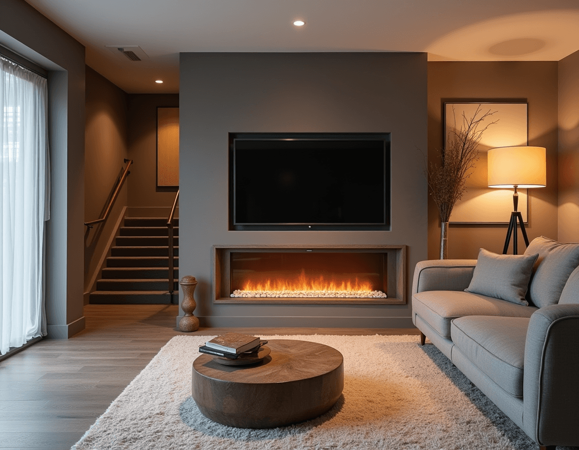 A modern fireplace is a simple basement renovation upgrade that completely changes the vibe. Depending on the setup, it can be as easy to install as a built-in cabinet or a media console. In this basement living room, the fireplace is the clear focal point. Paired with warm light from a tripod lamp and a plush shag rug, it gives the space that unmistakable Scandinavian hygge feel.