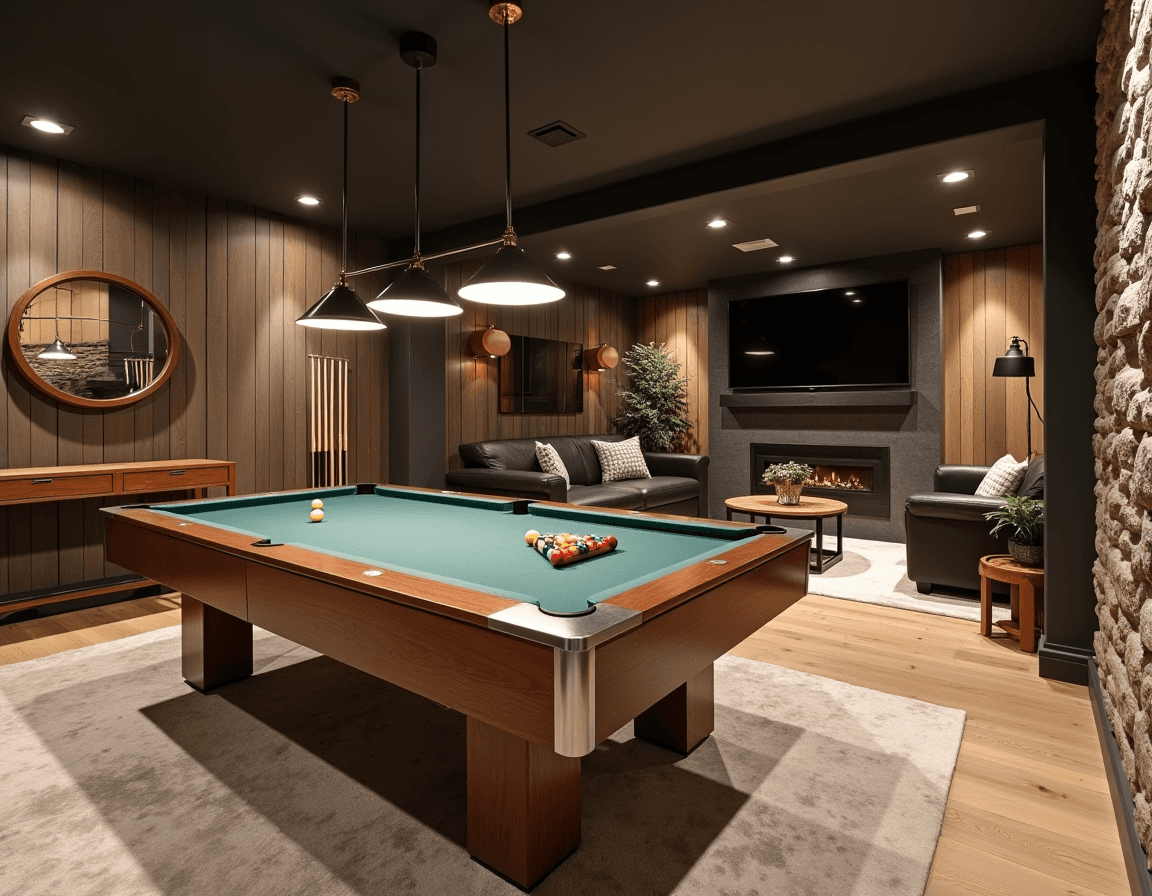 Pendant lights do more than brighten a pool table or game table — they help carry the theme. Here, the dark finish, focused beams, and dramatic overhead silhouette channel the look of a sophisticated pool hall.