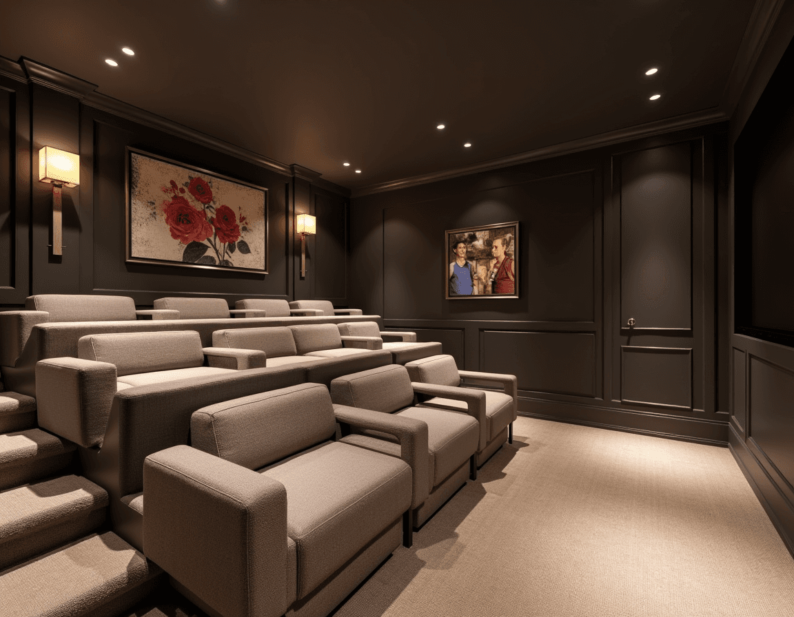 Designed for movie buffs, gamers, and TV lovers alike, this finished basement transforms into a binge-watcher’s personal paradise. Tiered seating gives everyone a clear view, while black-painted walls and a pair of deco wall sconces set a cozy, cinematic tone. Oversized armchairs give everyone a comfy view, perfect for long marathons, but the layout works just as well with a mix of recliners, chaises, or a roomy sectional.