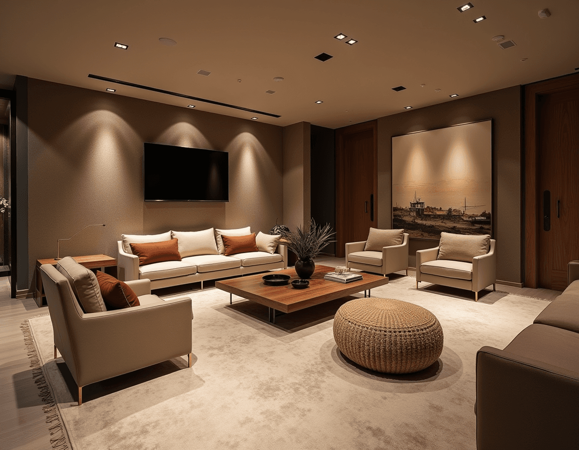 A basement can be just as refined as the rest of the home. Upholstery materials like bouclé, leather, and linen give large seating areas a more tailored look while keeping things relaxed and inviting. Here, three armchairs, two sofas, and a woven pouf create a layered furniture layout built for game nights and at-home film fests. The mix of textures adds dimension without visual clutter — casual enough to sink into but refined enough to complement the rest of your home’s style.