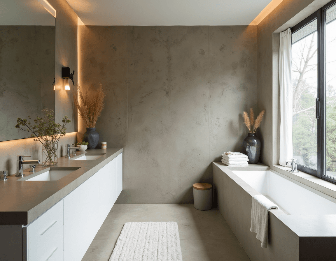 Concrete can be used on the floors, vanity, and tub surround to add texture. Be sure to add accents, like crisp white cabinets and a variety of ceramic vases and glass vessels, to keep the room from looking like a construction site.
