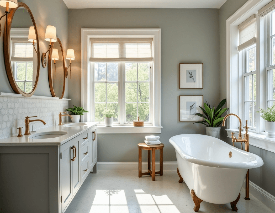 A clawfoot bathtub, sage cabinets, and vintage wall sconces might read more pastoral than modern. But when paired with the right materials — like white tile, slim brass fixtures, and circular mirrors — the result still feels modern. It’s proof that stylish bathroom design doesn’t have to be stark or futuristic. Simply balance clean lines and thoughtful contrasts to keep the space fresh.